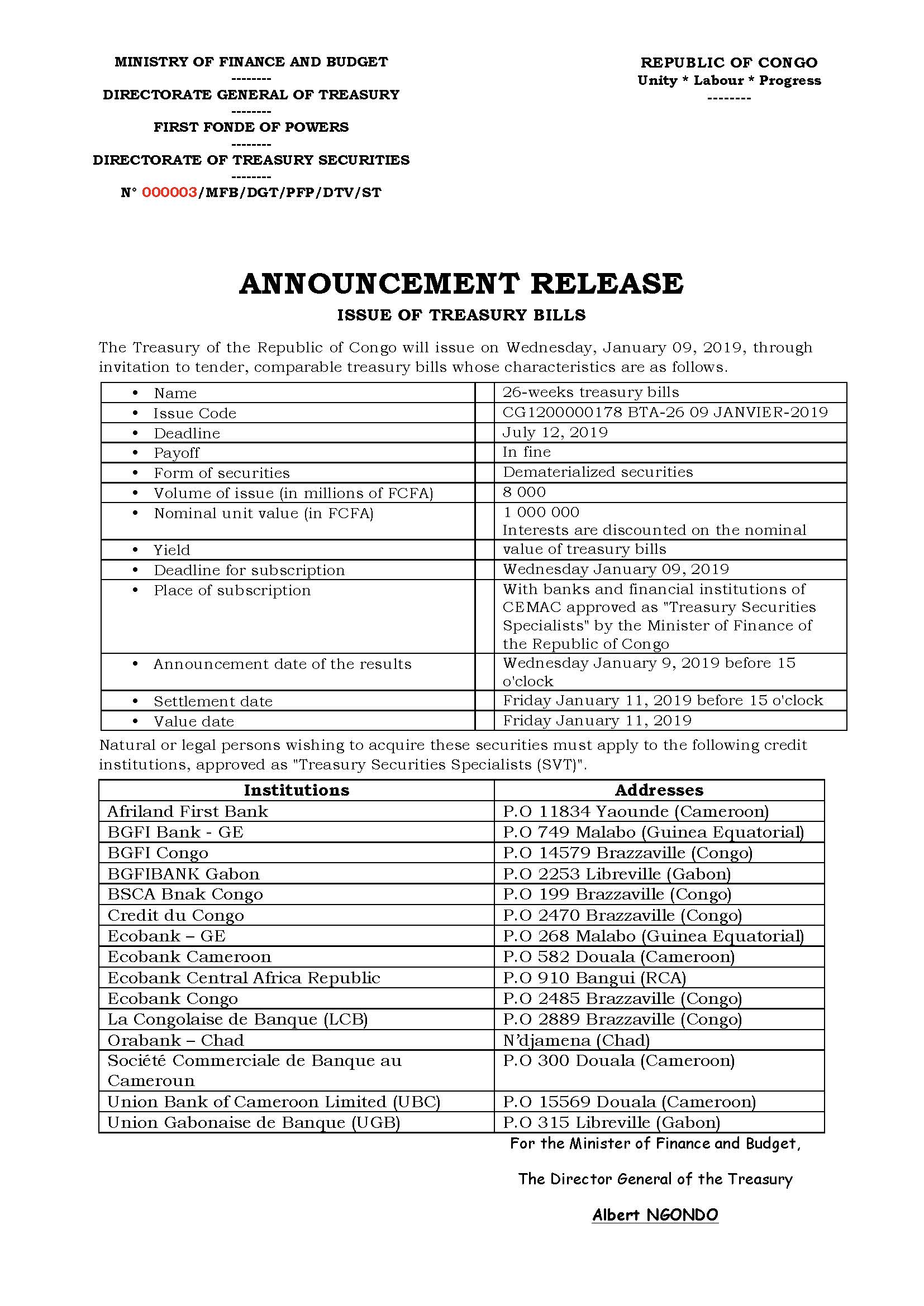 Announcement release - Issue of treasury bills on January 9, 2019