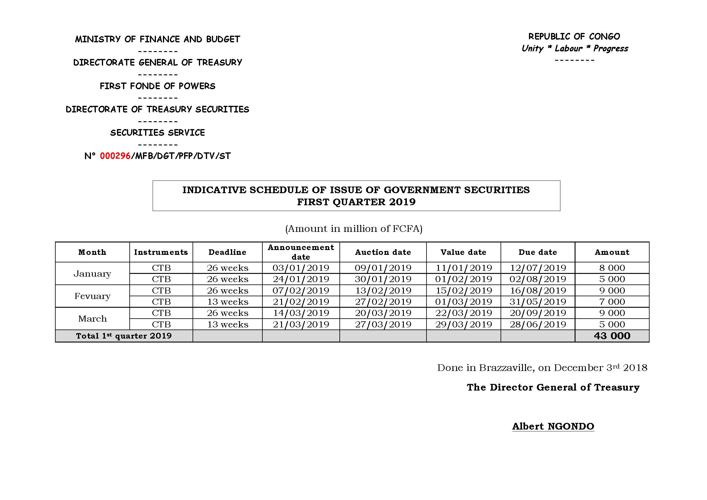INDICATIVE SCHEDULE OF ISSUE OF GOVERNMENT SECURITIES FIRST QUARTER 2019