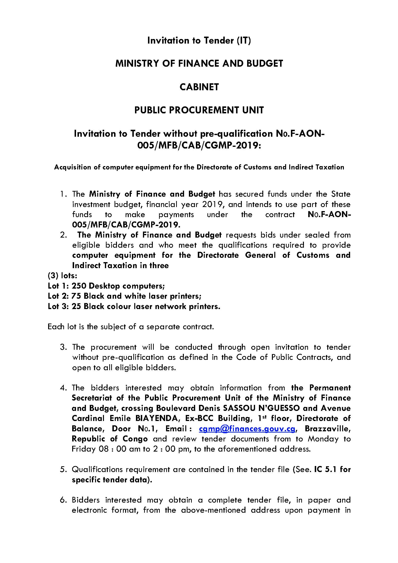 Invitation to Tender without pre-qualification N0.F-AON-005/MFB/CAB/CGMP-2019