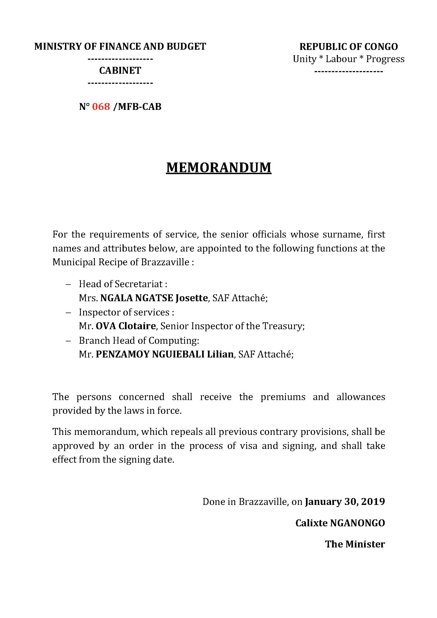 Memorandum N°068/MFB-CAB relating to the appointment of new officials at the Municipal Recipe of Brazzaville