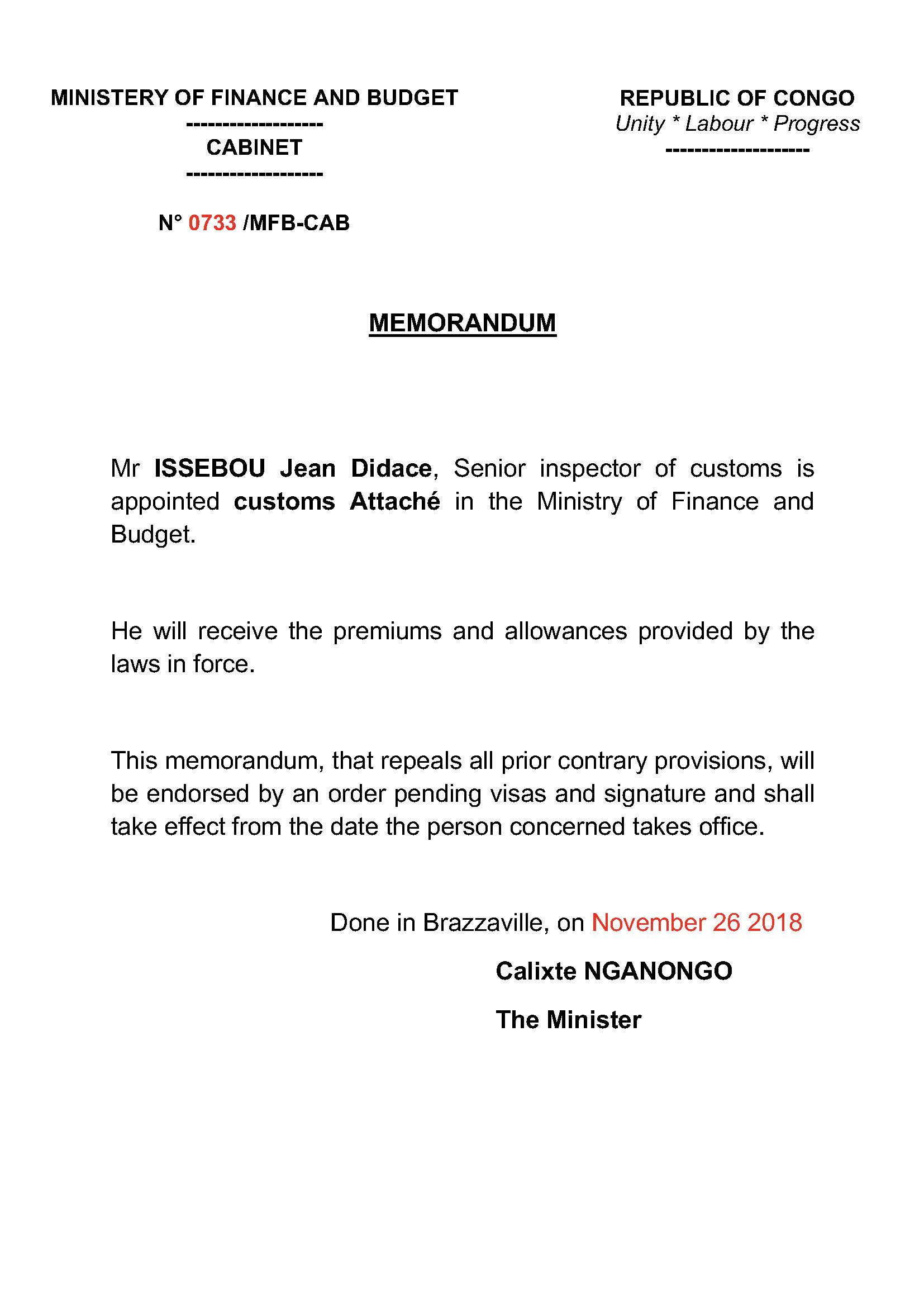 Memorandum N°0733/MFB-CAB relating to the appointment of the customs attaché