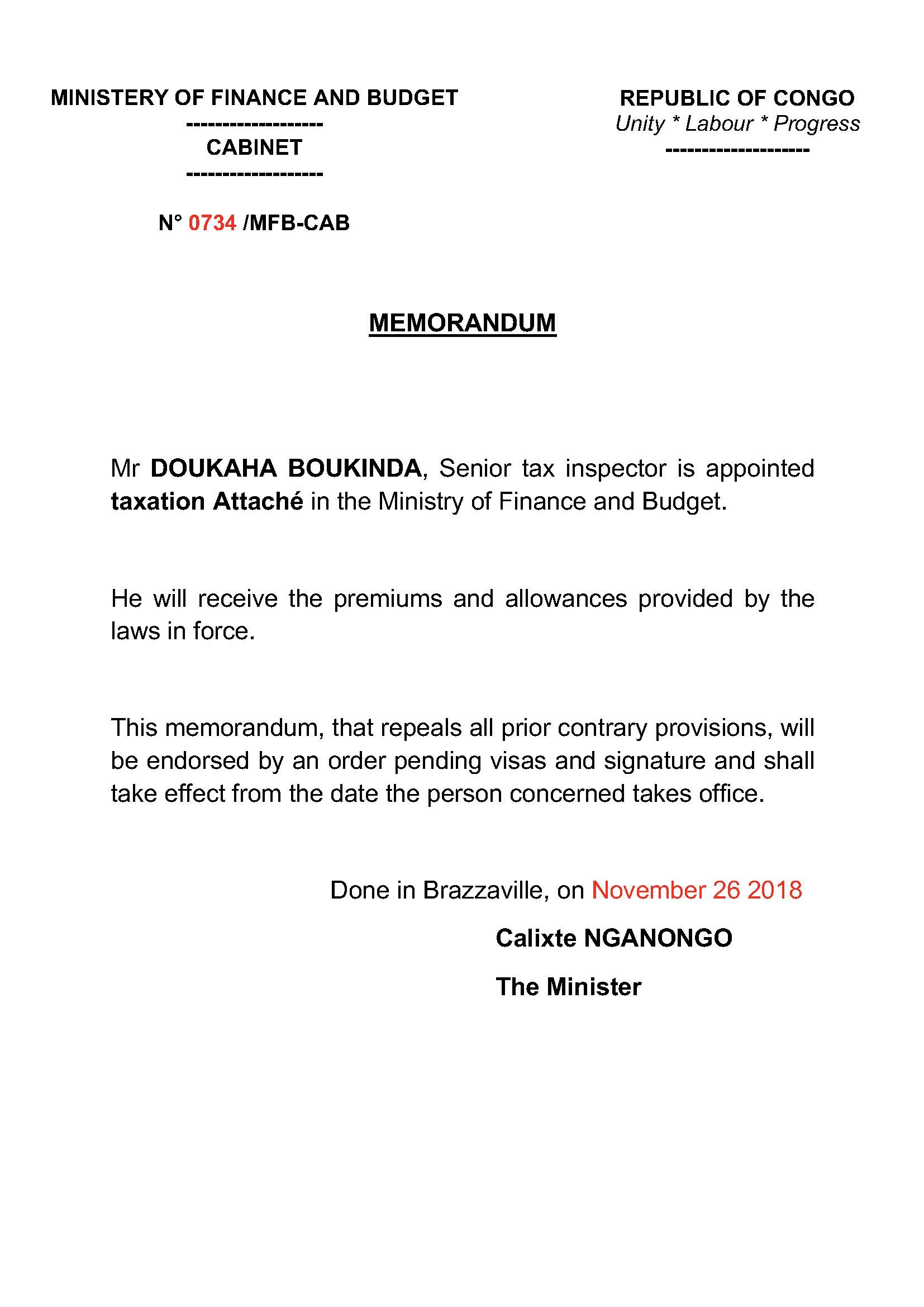 Memorandum N°0734/MFB-CAB relating to the appointment of the taxation attaché