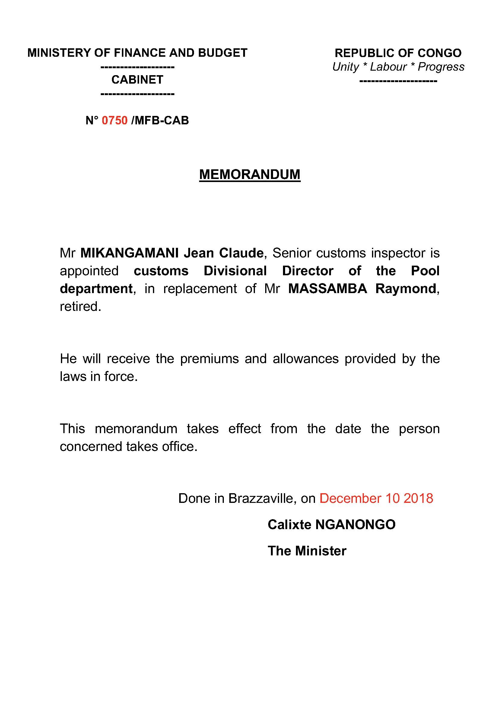 > Memorandum N°0750/MFB-CAB relating to the appointment of the customs divisional director of the Pool area