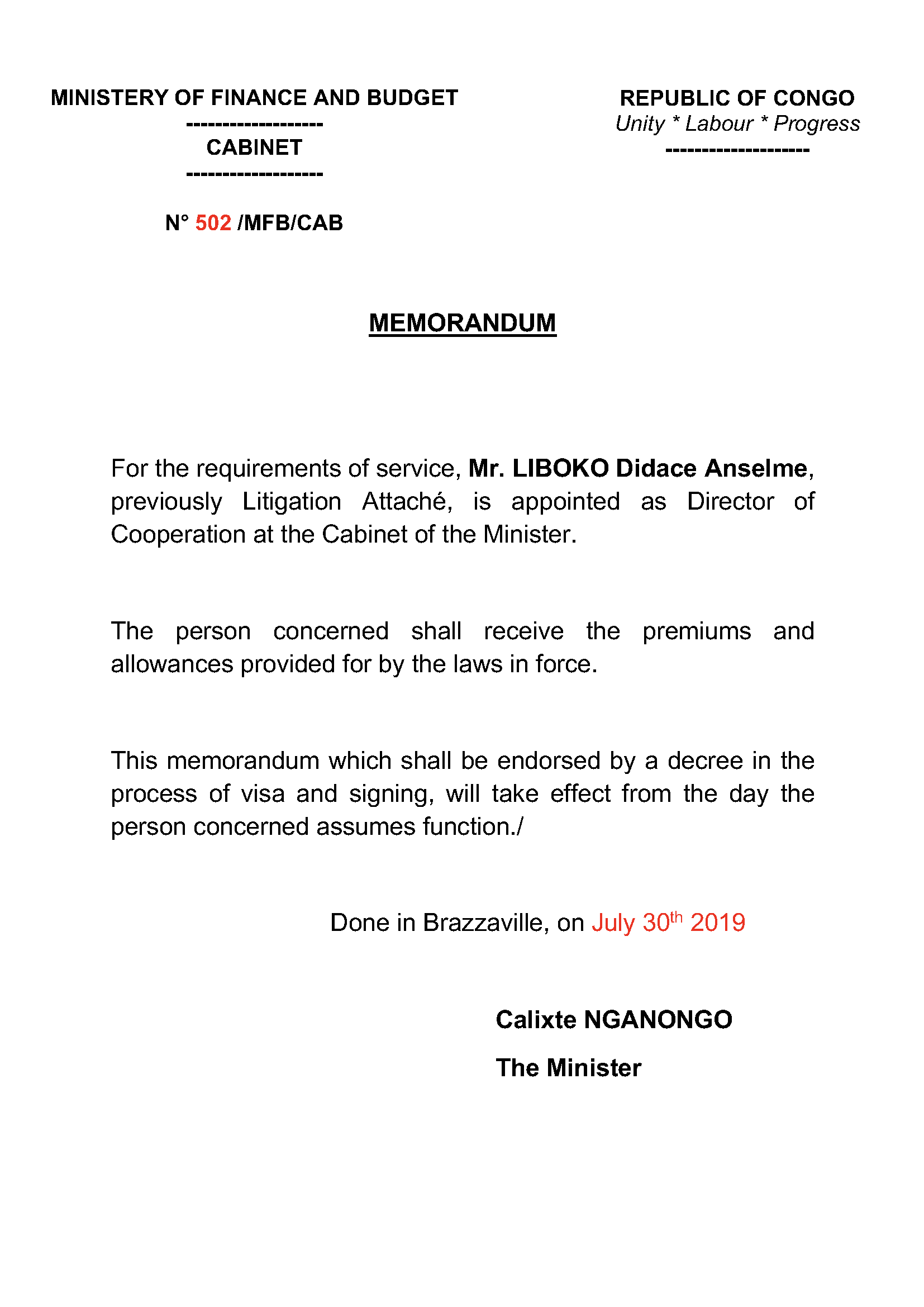 Memorandum N°502/MFB/CAB relating to the appointment of the Director of cooperation