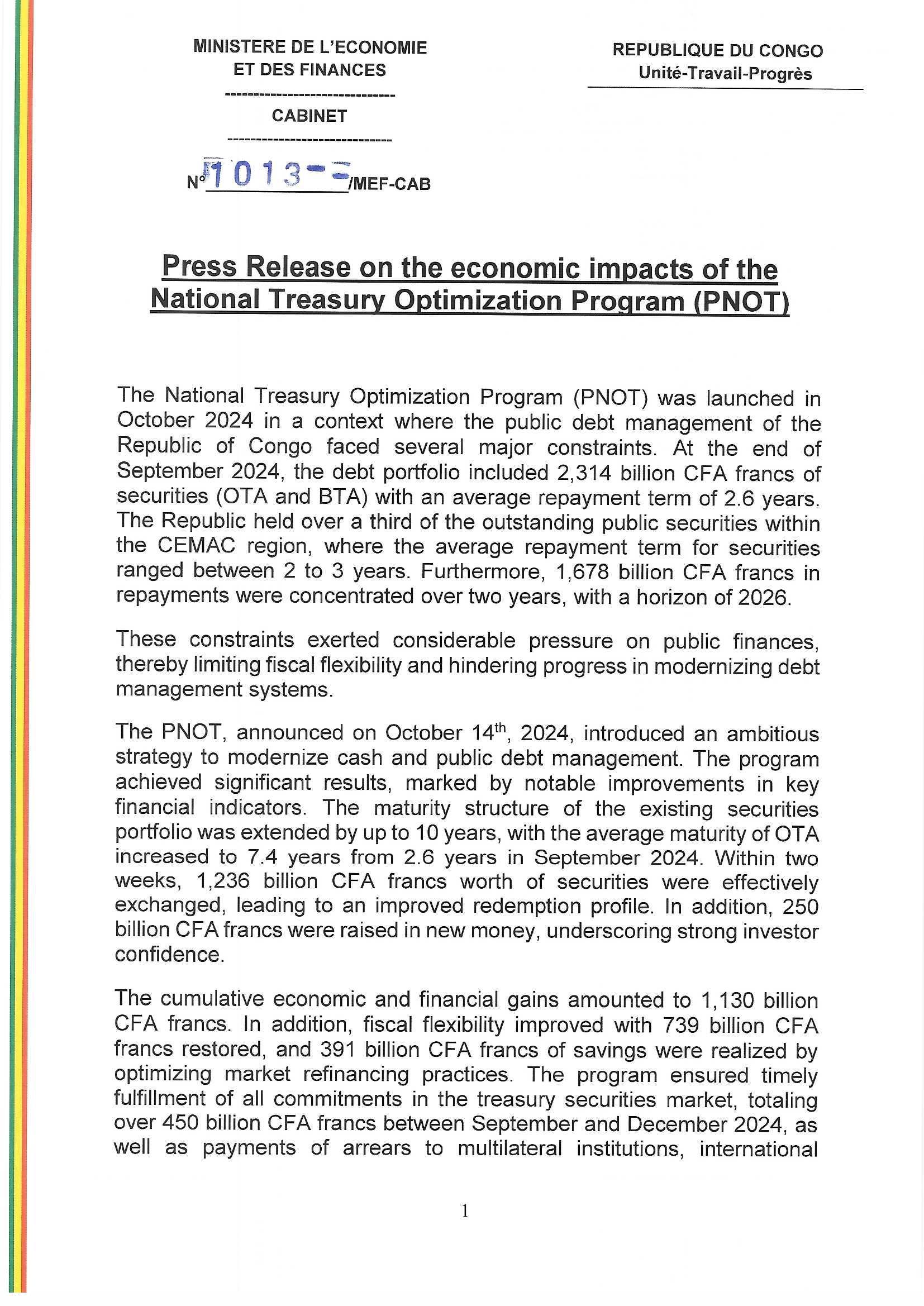 > Press release on the economics impacts of the National Treasury Optimization Program (PNOT)