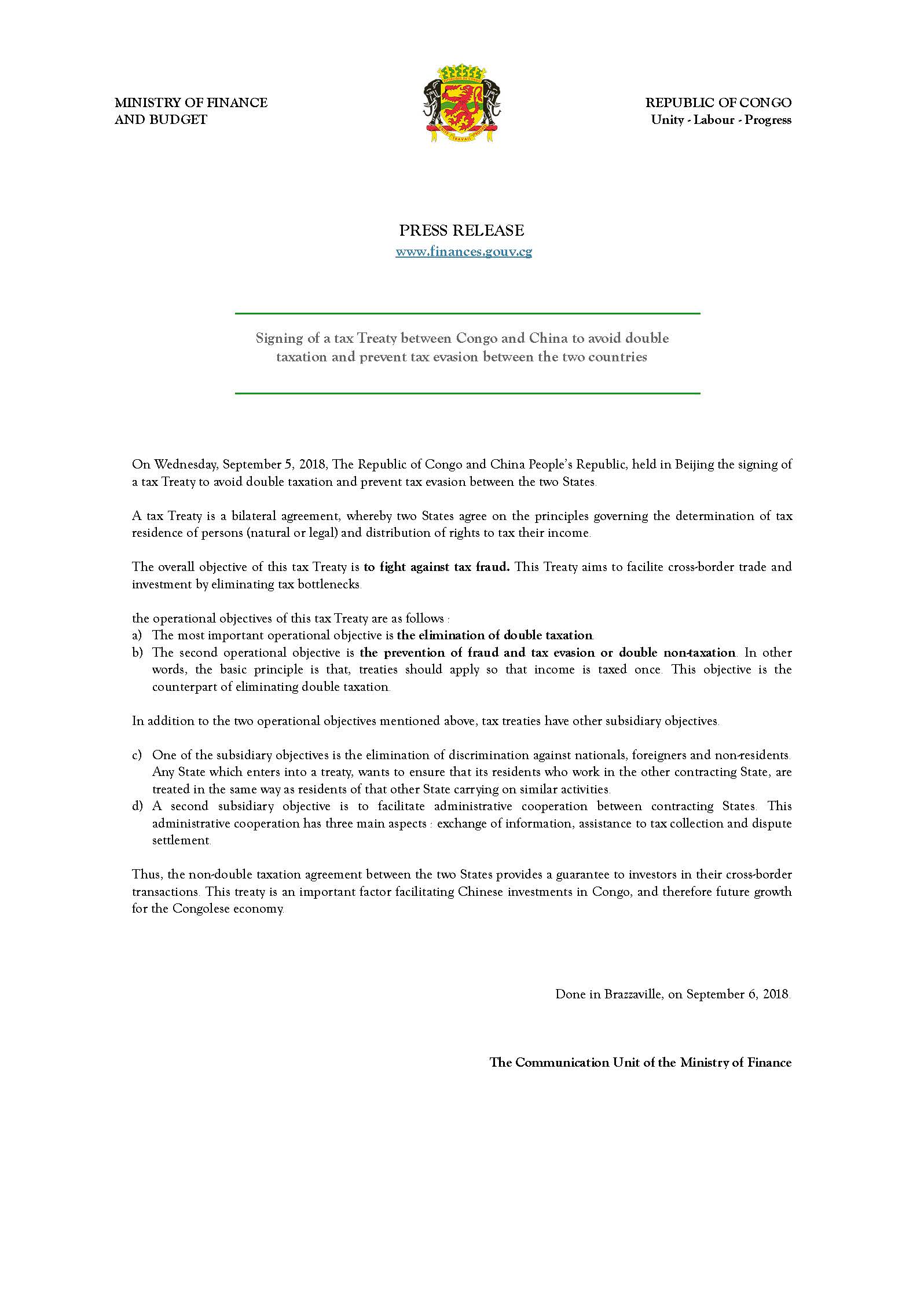> Press release - Signing of a tax Treaty between Congo and China