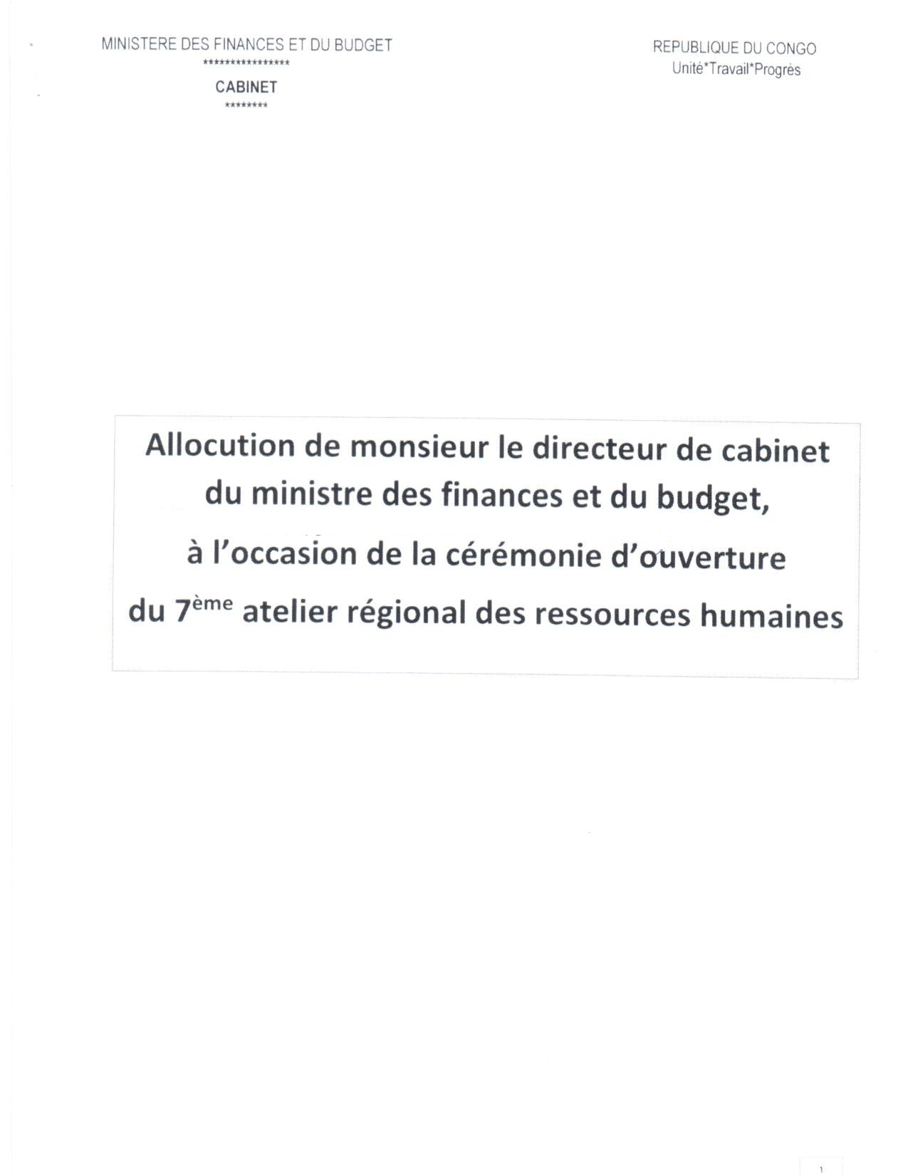 Allocution du Directeur de Cabinet du Ministre des Finances et du Budget, à l'occasion de l'ouverture du 7ème atelier des gestionnaires de formation et des ressources humaines pour la région Afrique occidentale et centrale à Brazzaville