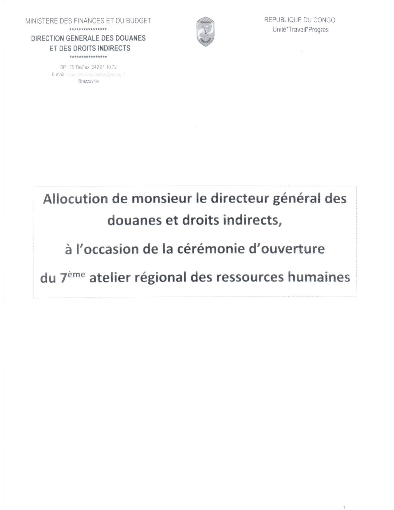 Allocution du Directeur Général des Douanes et des Droits Indirects à l'occasion de l'ouverture du 7ème atelier des gestionnaires de formation et des ressources humaines pour la région Afrique occidentale et centrale à Brazzaville