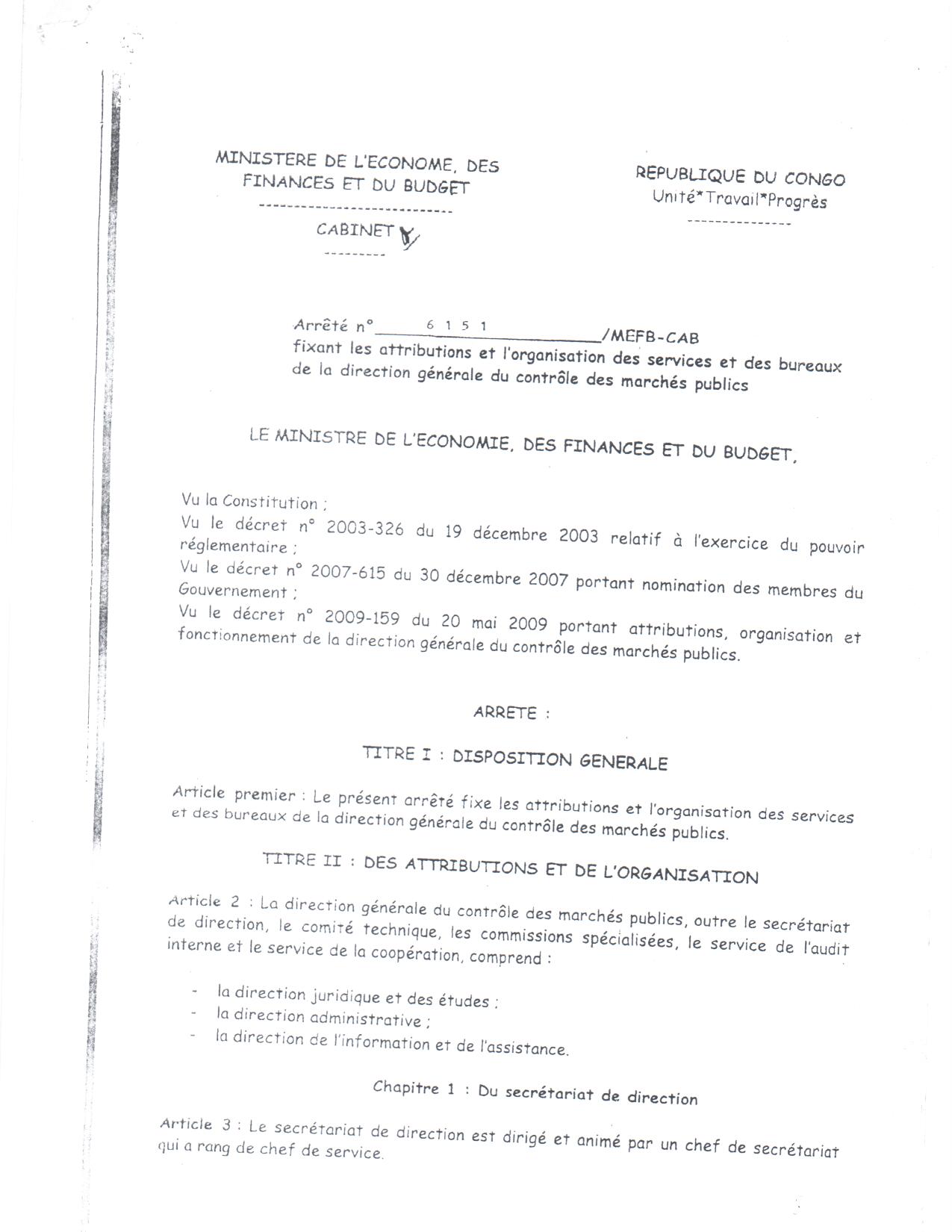 > Arrêté N°6151/MEFB-CAB fixant les attributions et l'organisation des services et des bureaux de la direction générale du contrôle des marchés publics