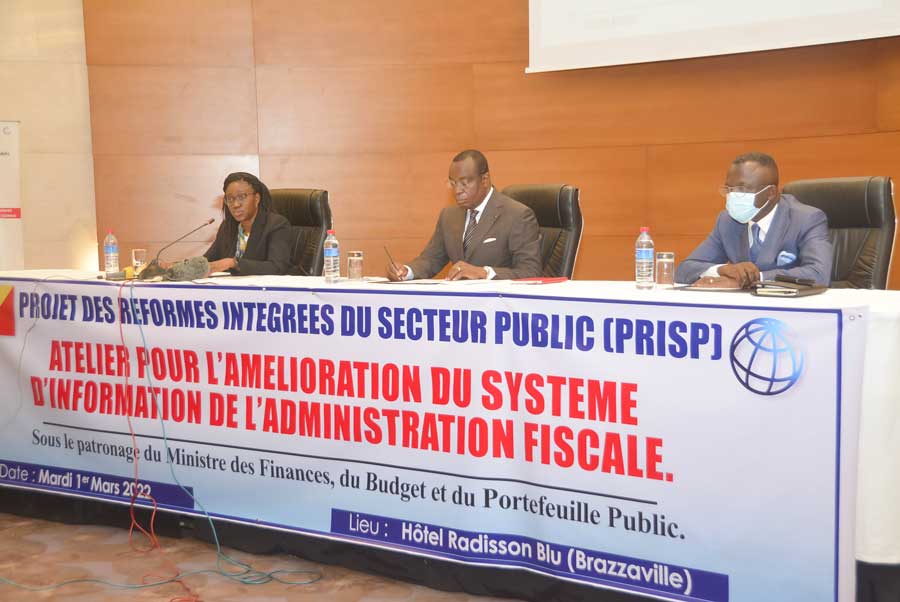 Rigobert Roger Andely, Ministre des Finances, du Budget et du Portefeuille public, assisté de son collègue Ludovic Ngatsé, en charge du Budget, a ouvert, lundi 1er mars 2022 à Brazzaville, l’atelier pour l’amélioration du système d’information de l’administration fiscale, notamment le Projet E-TAX (Système intégré de gestion des impôts et taxes). En présence de Madame Korotoumou Ouattara, Représentante de la Banque mondiale (BM) au Congo, institution responsable du Projet des réformes intégrées du secteur public (PRISP).