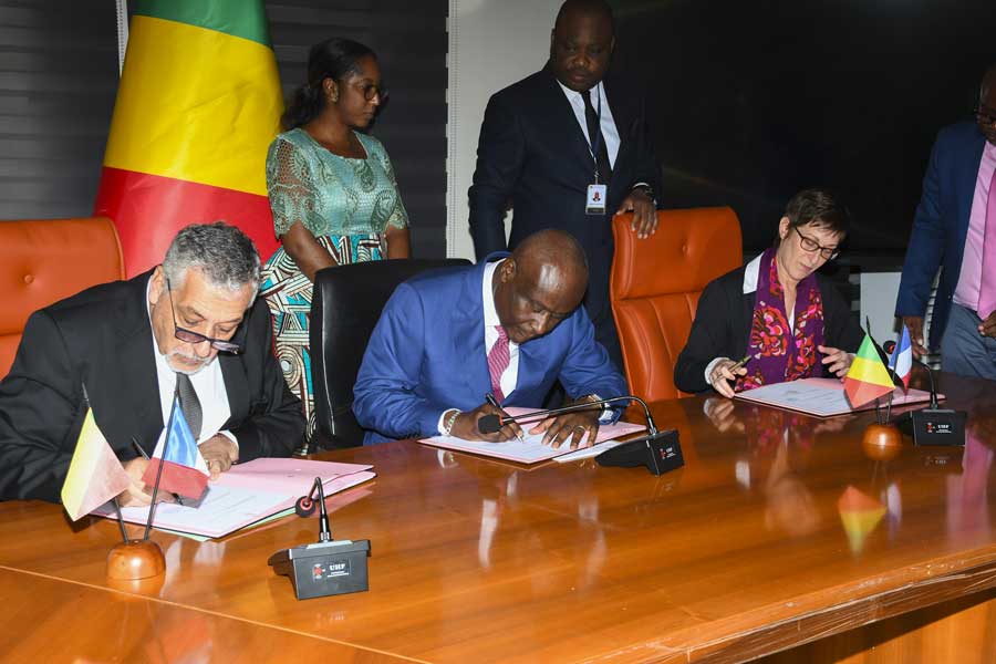 Jean-Baptiste Ondaye, Ministre congolais de l’Economie et des Finances, représentant le gouvernement congolais, et François Barateau, Ambassadeur de France au Congo, représentant le gouvernement français, ont signé, jeudi 23 mars 2023 à Brazzaville, le protocole d’Accord pour le lancement du Projet « Fonds de solidarité pour les projets innovants (FSPI) Gouvernance des Industries extractives ».