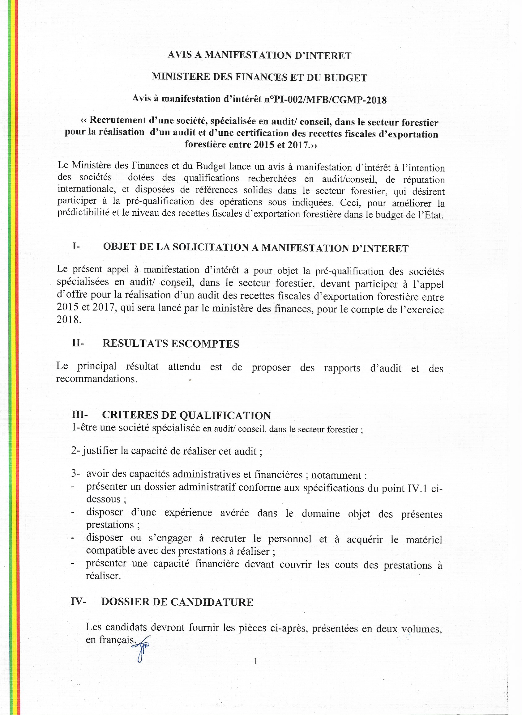 > Avis à manifestation d'Intérêt N° PI-002/MFB/CGMP-2018