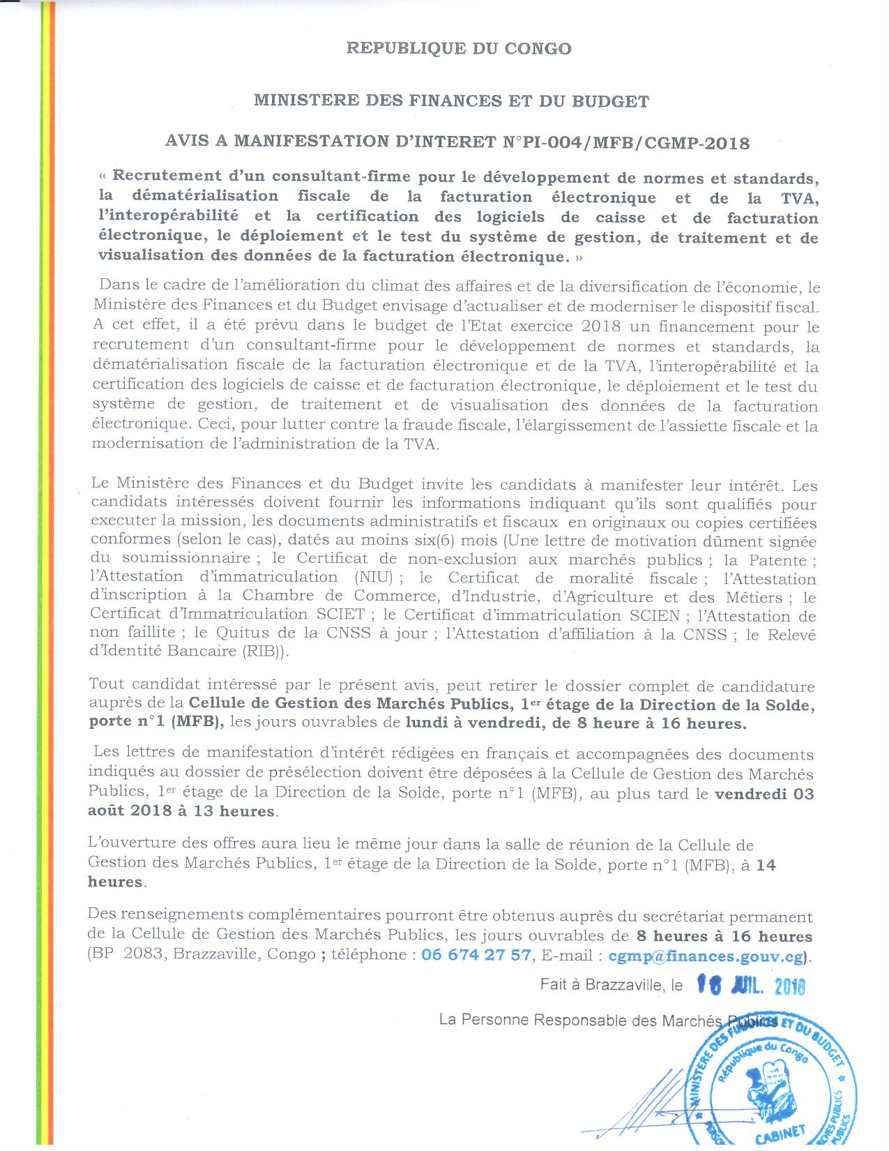 Avis à manifestation d'Intérêt N° PI-004/MFB/CGMP-2018