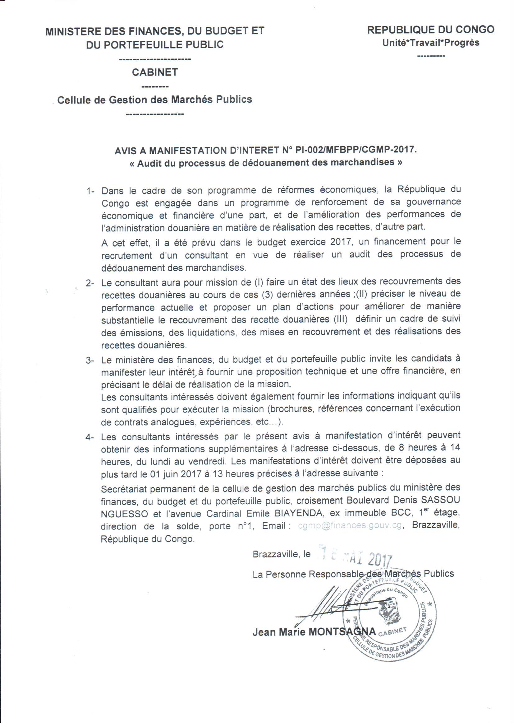 > Avis à manifestation d'intérêt pour l'audit du processus de dédouanement des marchandises