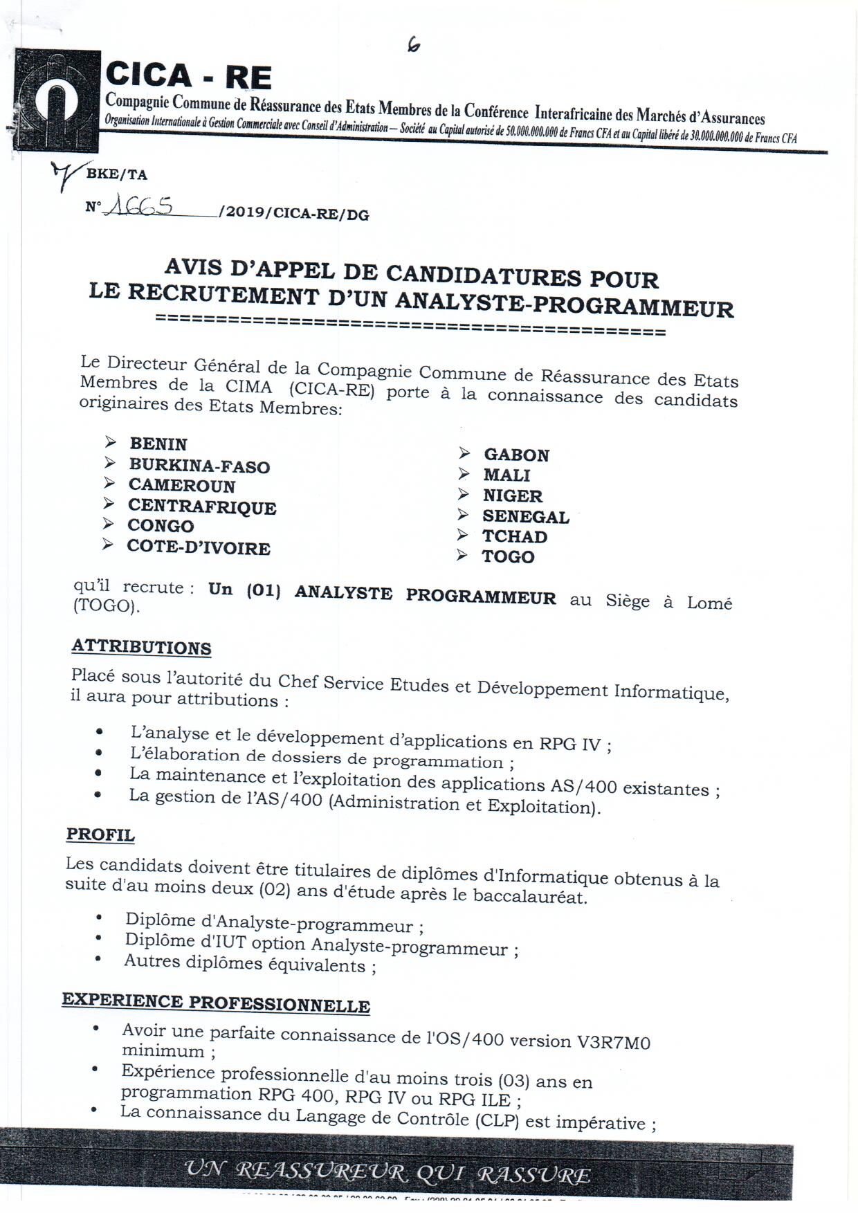 Avis d'appel à candidatures pour le recrutement d'un analyste programmeur à la CICA-RE à Lomé (Togo)
