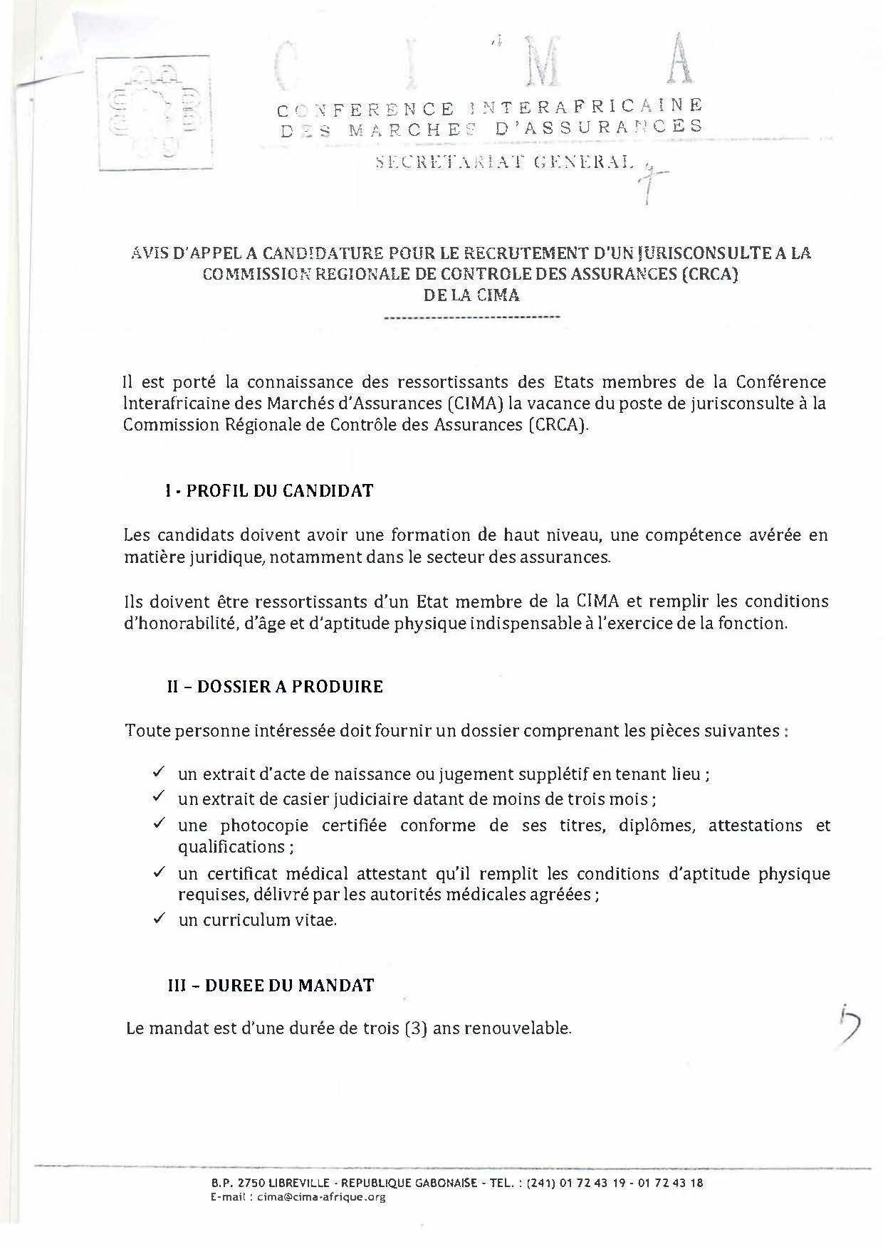 > Avis d'appel à candidatures pour le recrutement d'un jurisconsulte, à la Commission Régionale du Contrôle des Assurances (CRCA) de la CIMA