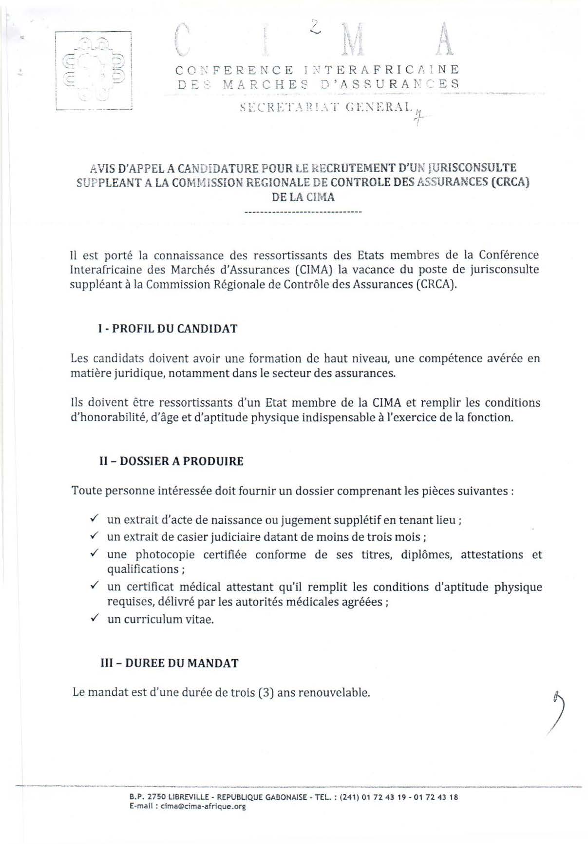 > Avis d'appel à candidatures pour le recrutement d'un jurisconsulte suppléant, à la Commission Régionale du Contrôle des Assurances (CRCA) de la CIMA