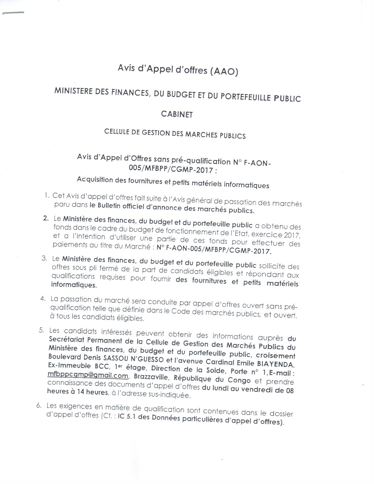 > Avis d'Appel d'Offres - Acquisition des fournitures et petits matériels informatiques