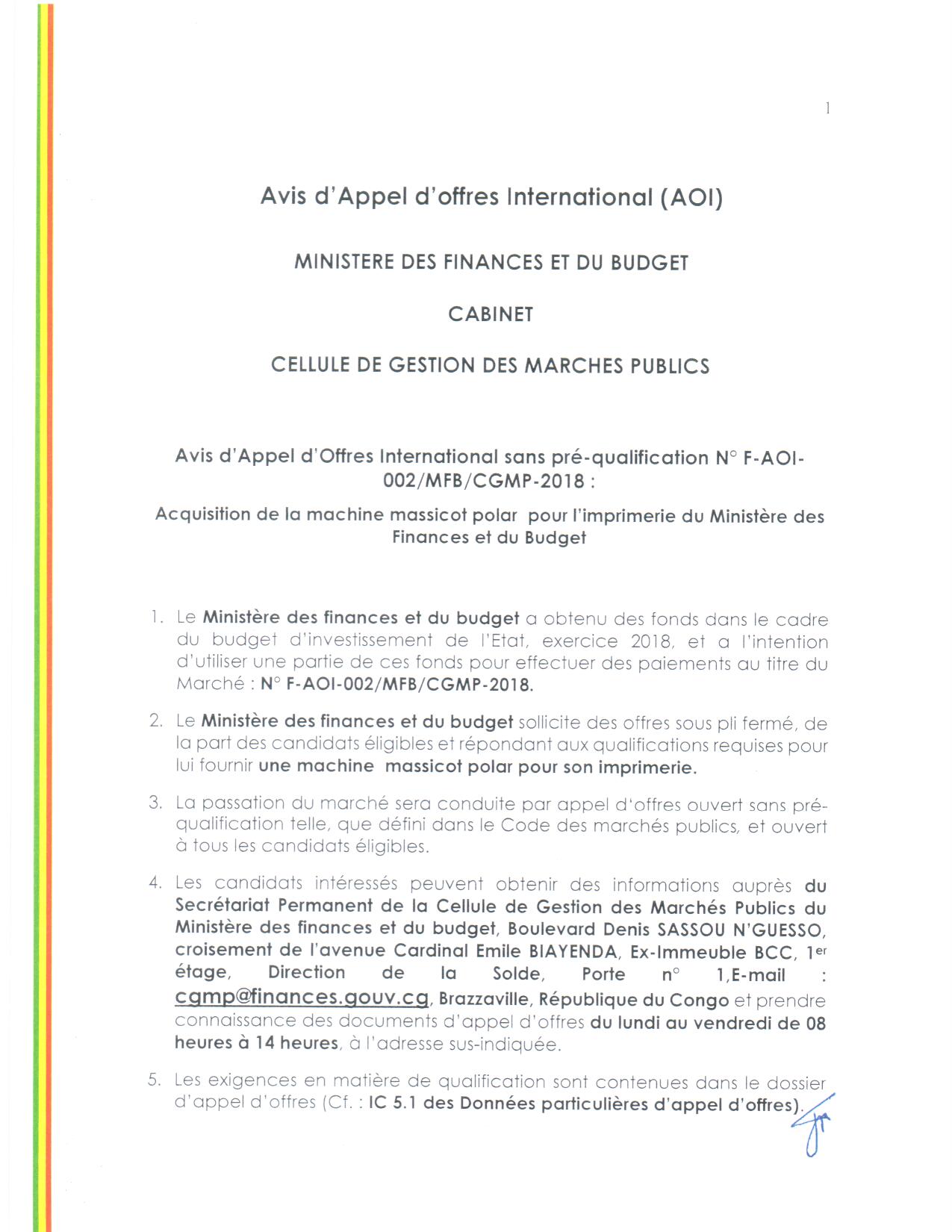 > Avis d'Appel d'Offres International sans pré-qualification N° F-AOI-002/MFB/CGMP-2018