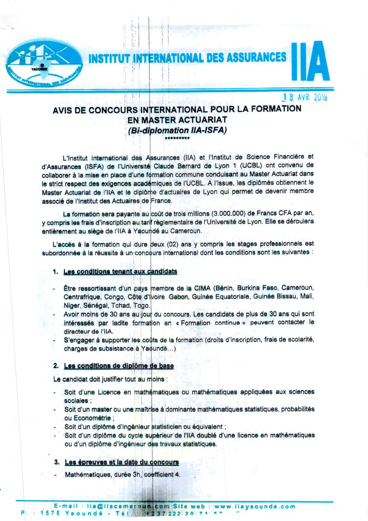Avis de concours international pour la formation en master actuariat (Bi-diplomation IIA-ISFA)