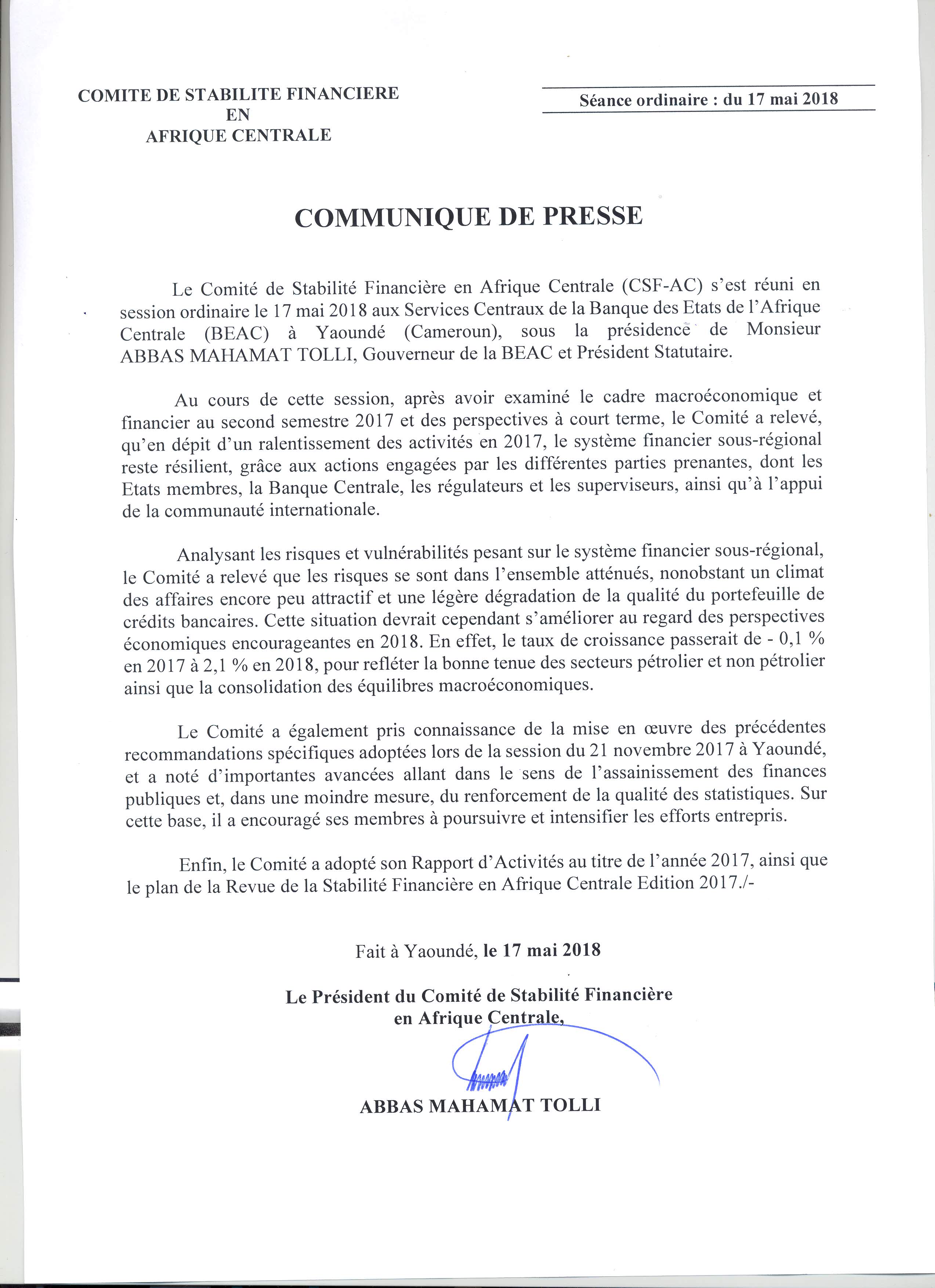 > Communiqué de presse du Comité de Stabilité Financière en Afrique Centrale