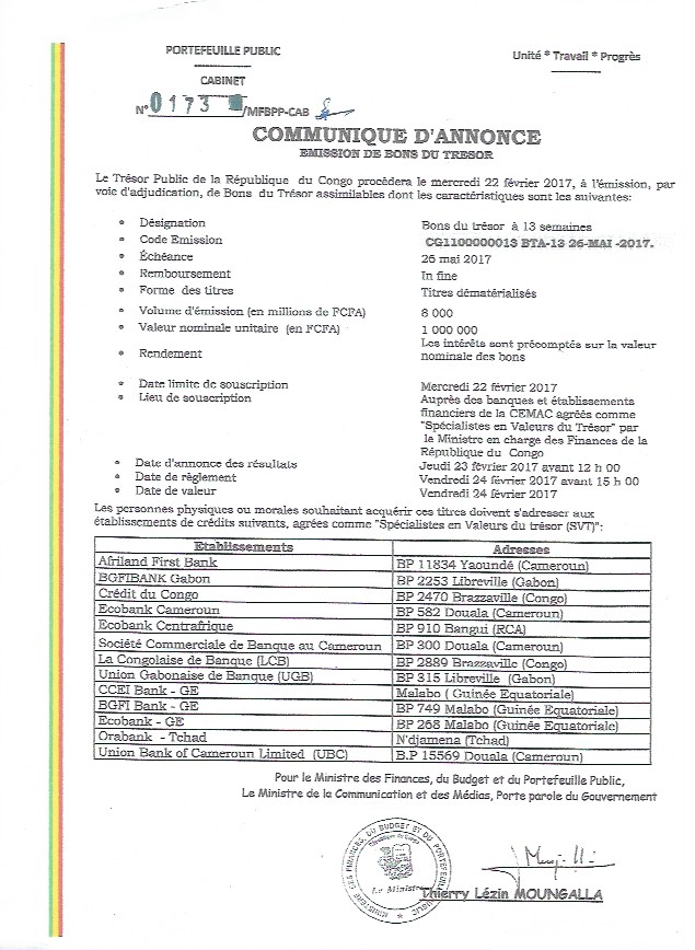 > Communiqué d'annonce - Émission des Bons de Trésor