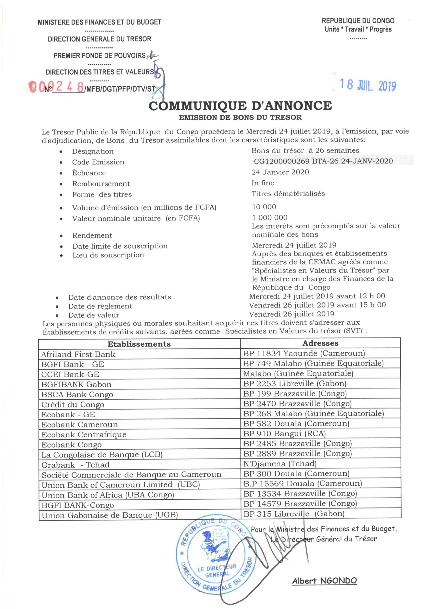 Communiqué d'annonce - émission des bons de Trésor du 24 juillet 2019
