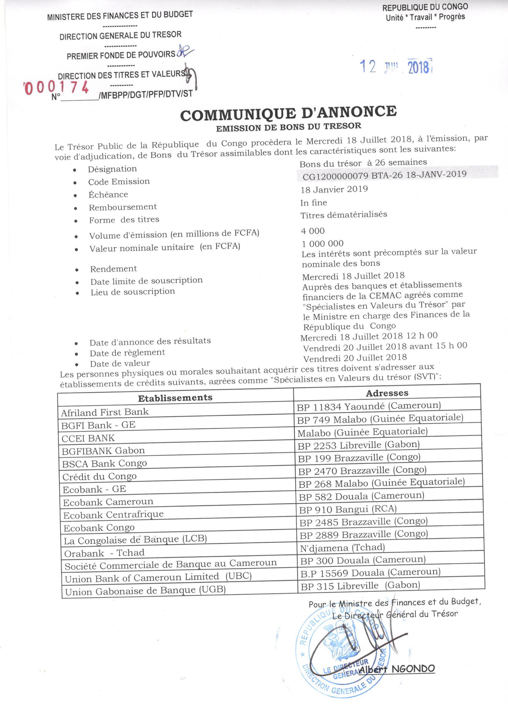Communiqué d'annonce - émission des bons du trésor du 18 juillet 2018