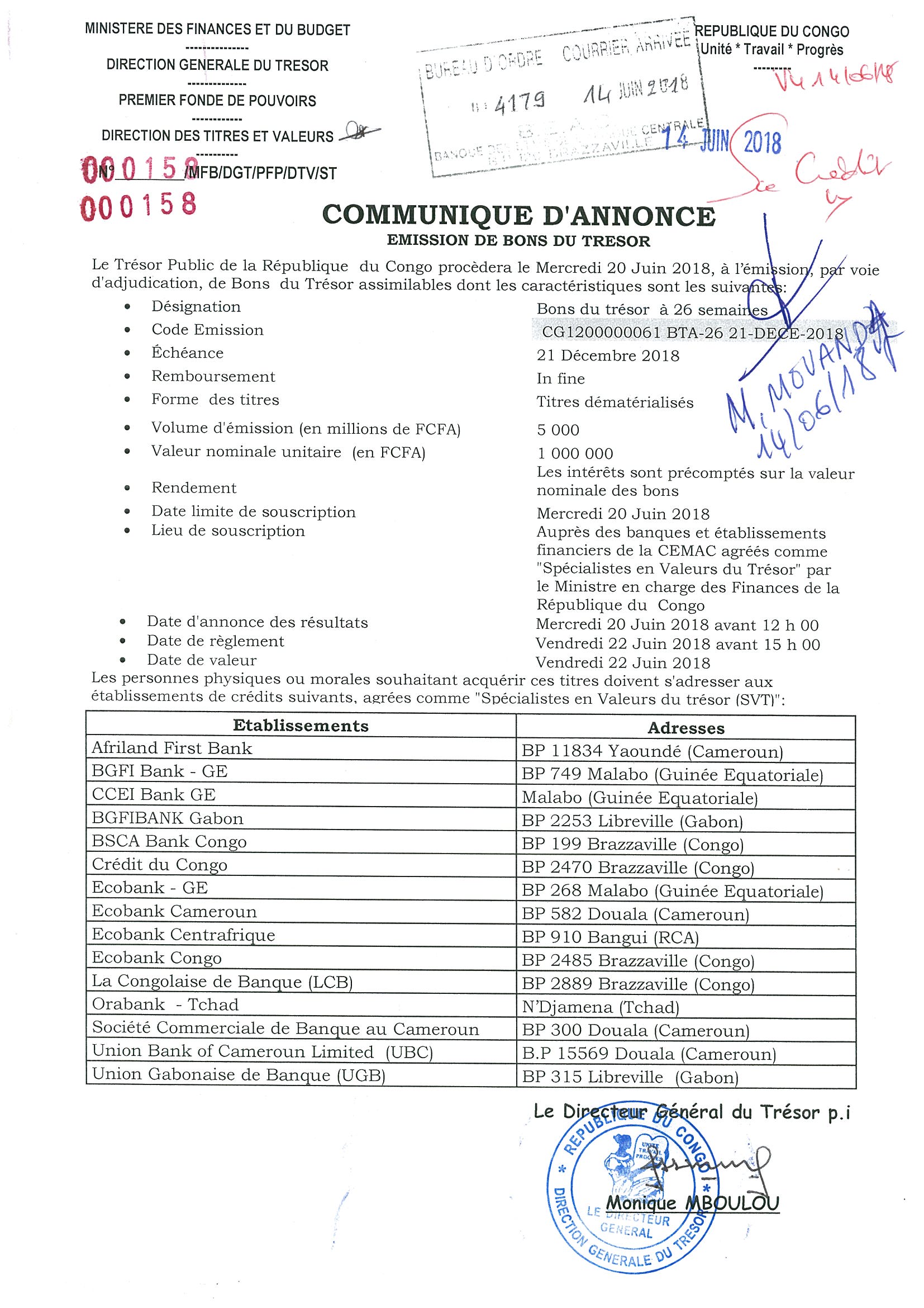 Communiqué d'annonce - émission des bons du trésor du 20 juin 2018