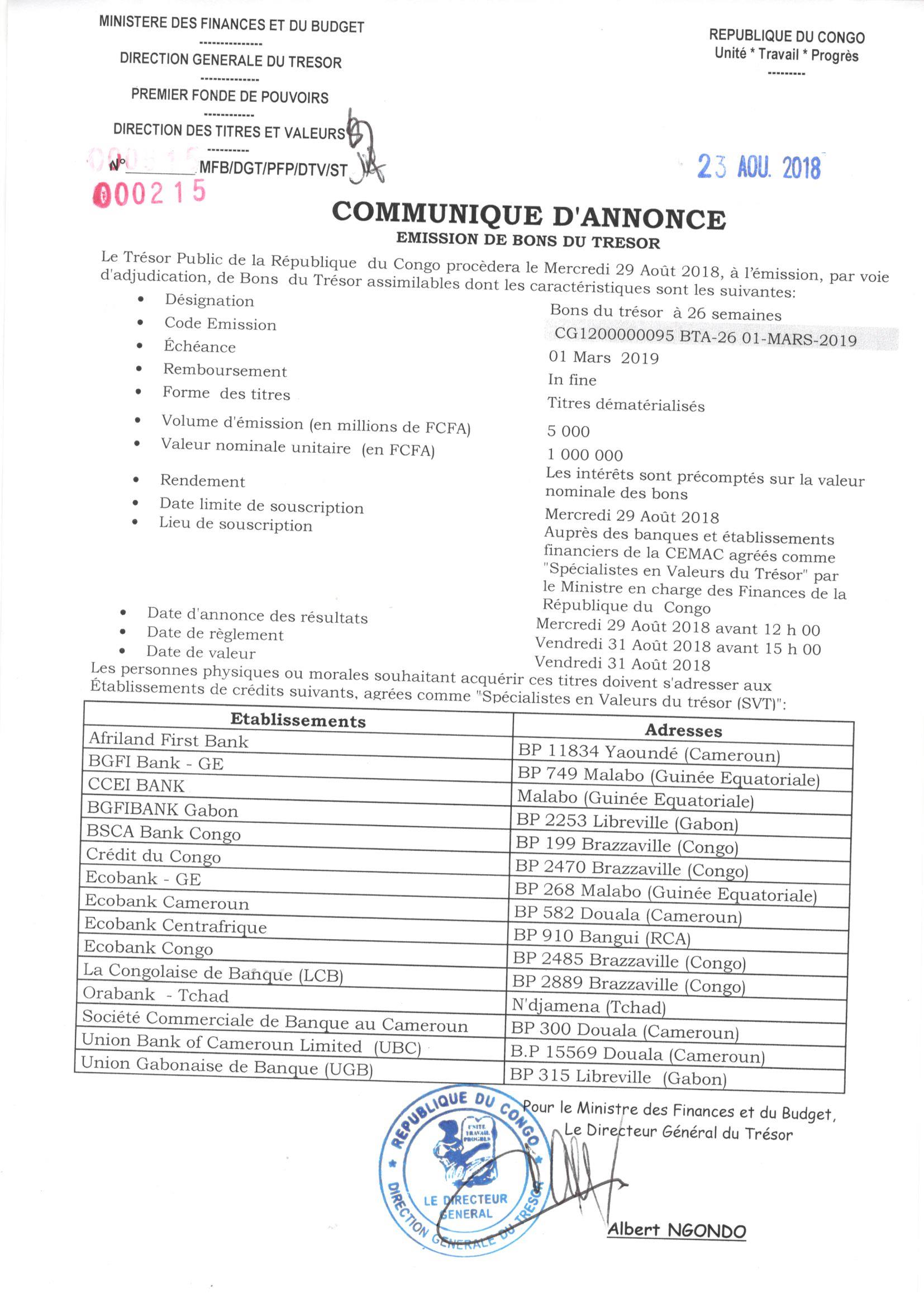 > Communiqué d'annonce - émission des bons du trésor du 29 Août 2018