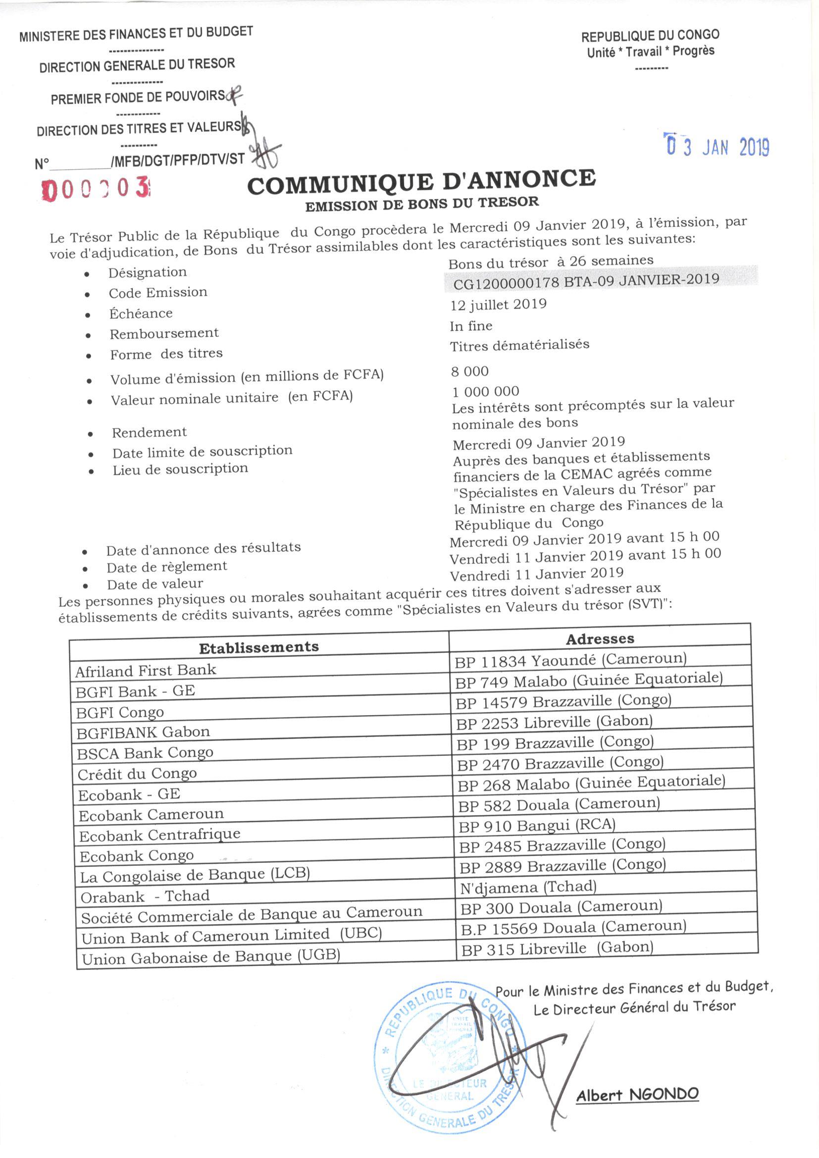 Communiqué d'annonce - émissions des bons de Trésor du 9 Janvier 2019