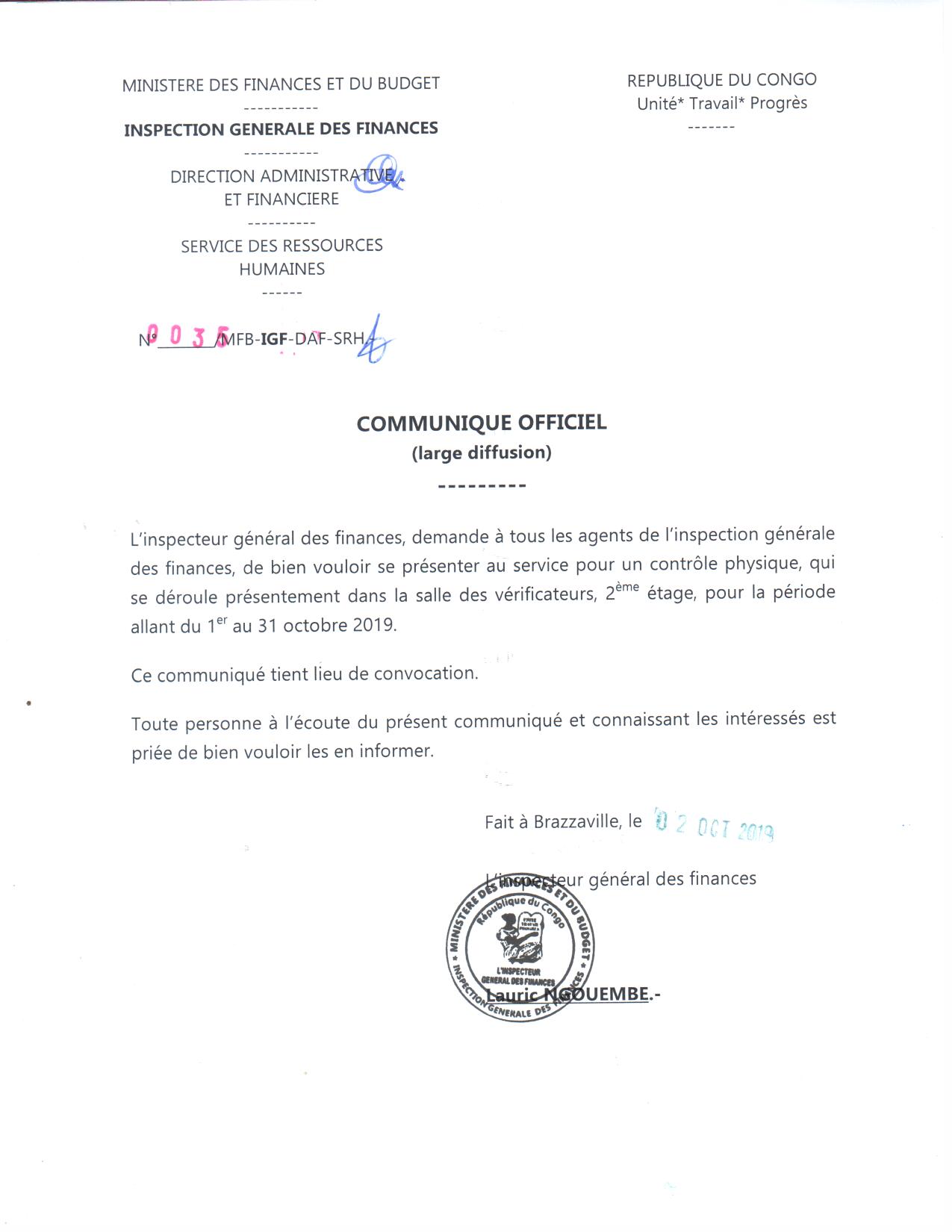> Communiqué de l'Inspection Générale des Finances sur le contrôle physique de ses agents