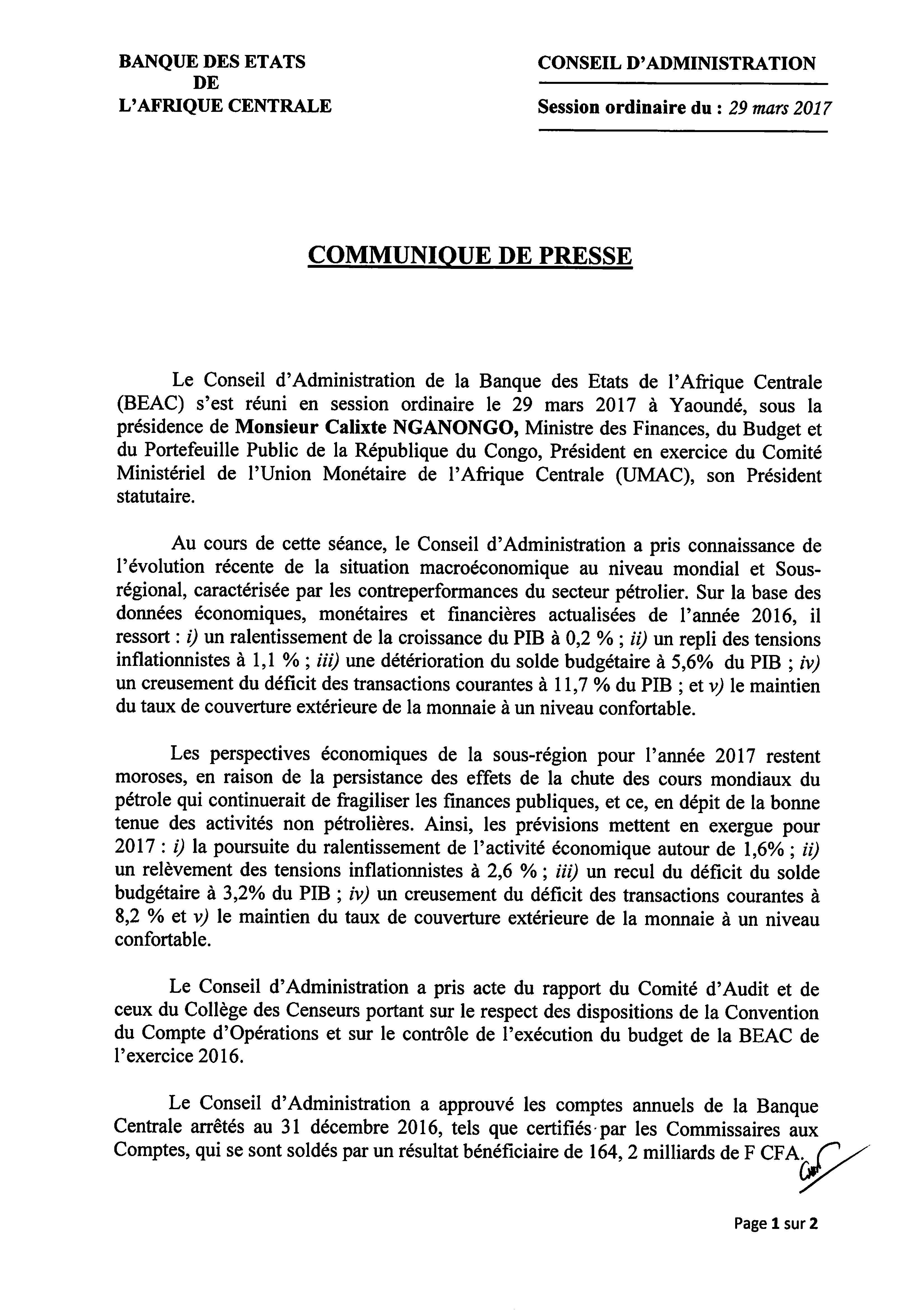 > Communiqué de presse du conseil d'administration ordinaire de la Banque des Etats de l'Afrique Centrale du 29 mars 2017