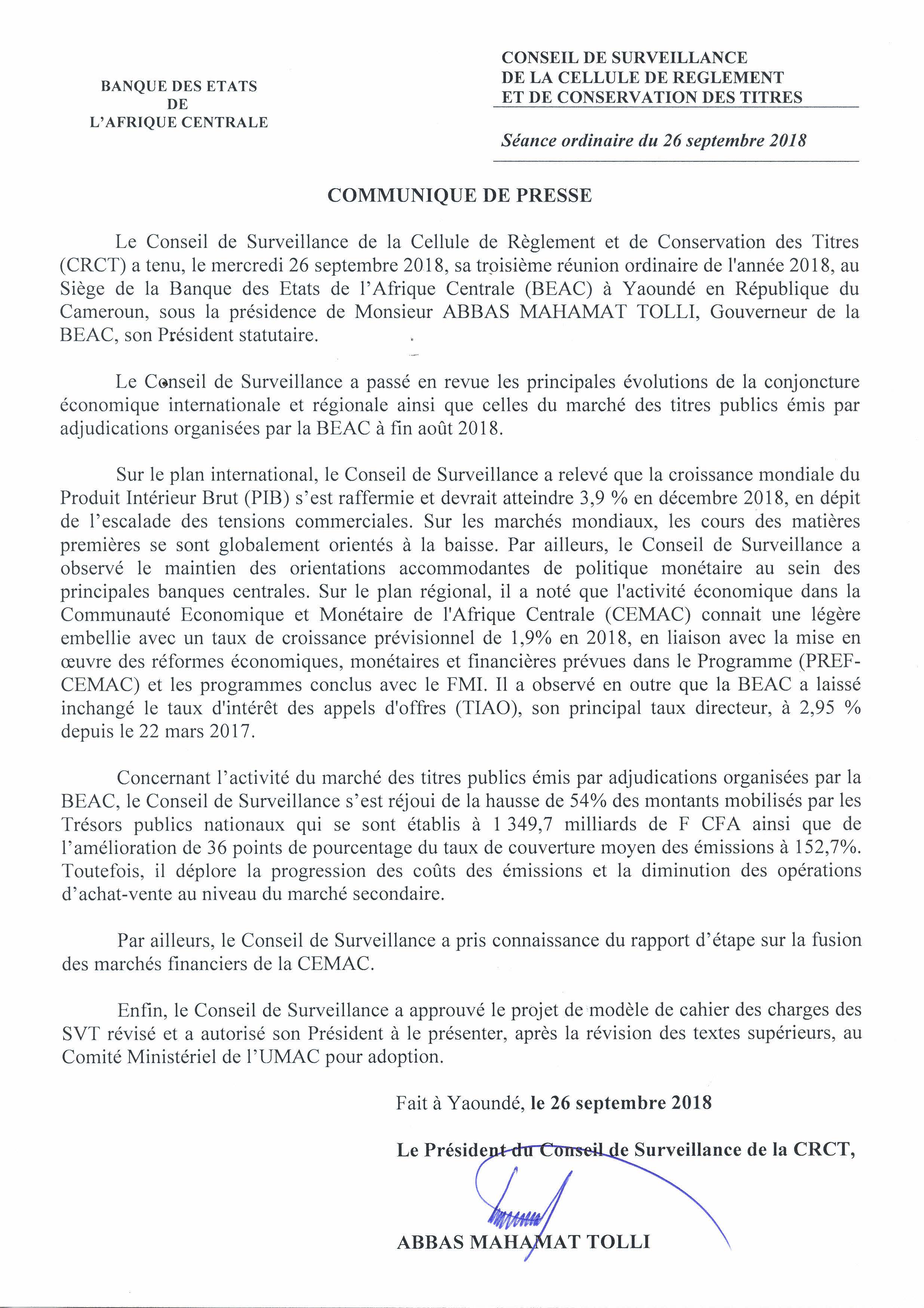 > Communiqué de presse du Conseil de Surveillance de la Cellule de Règlement et de Conservation des Titres (CRCT) - 26 Septembre 2018