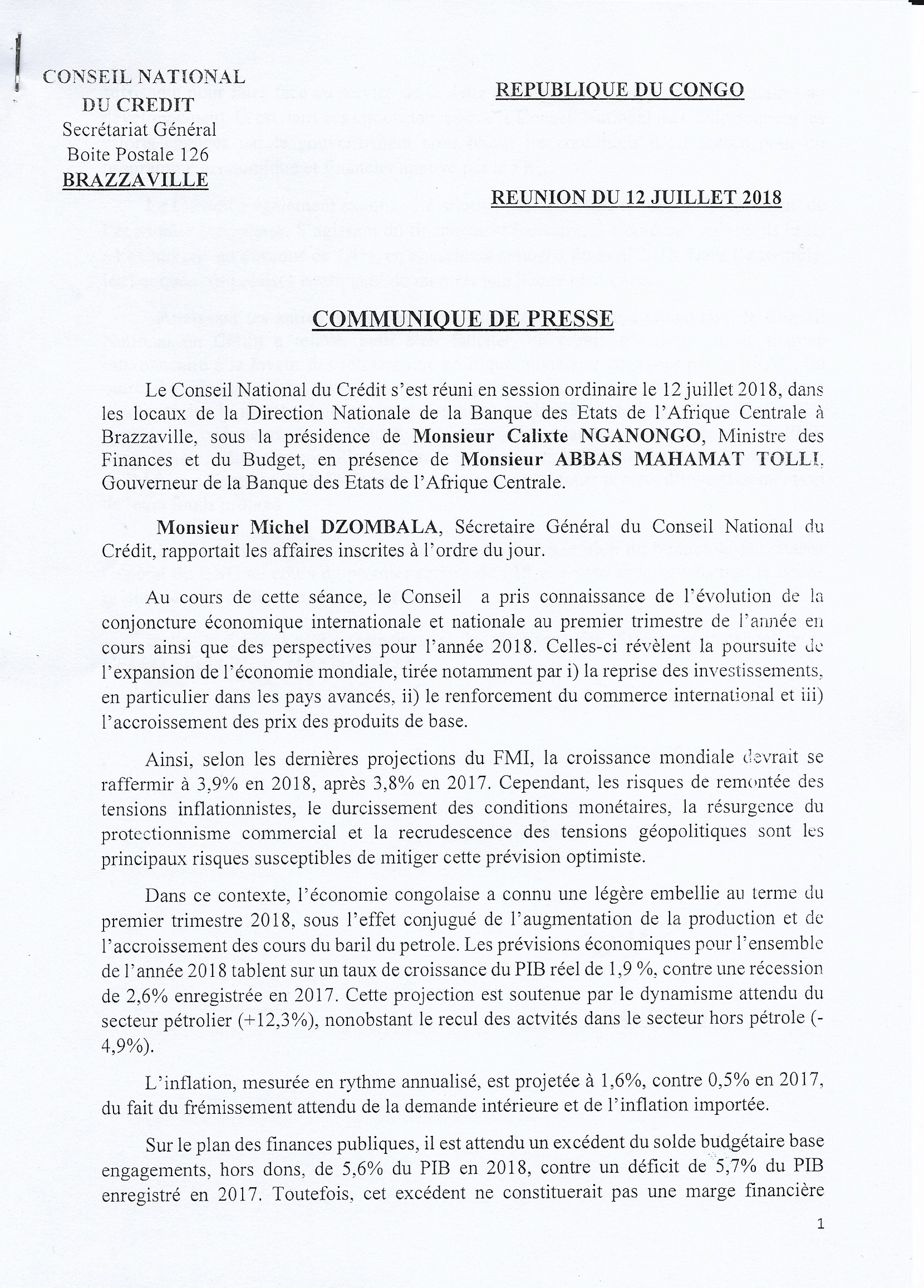 > Communiqué de presse du Conseil national du crédit du 12 juillet 2018