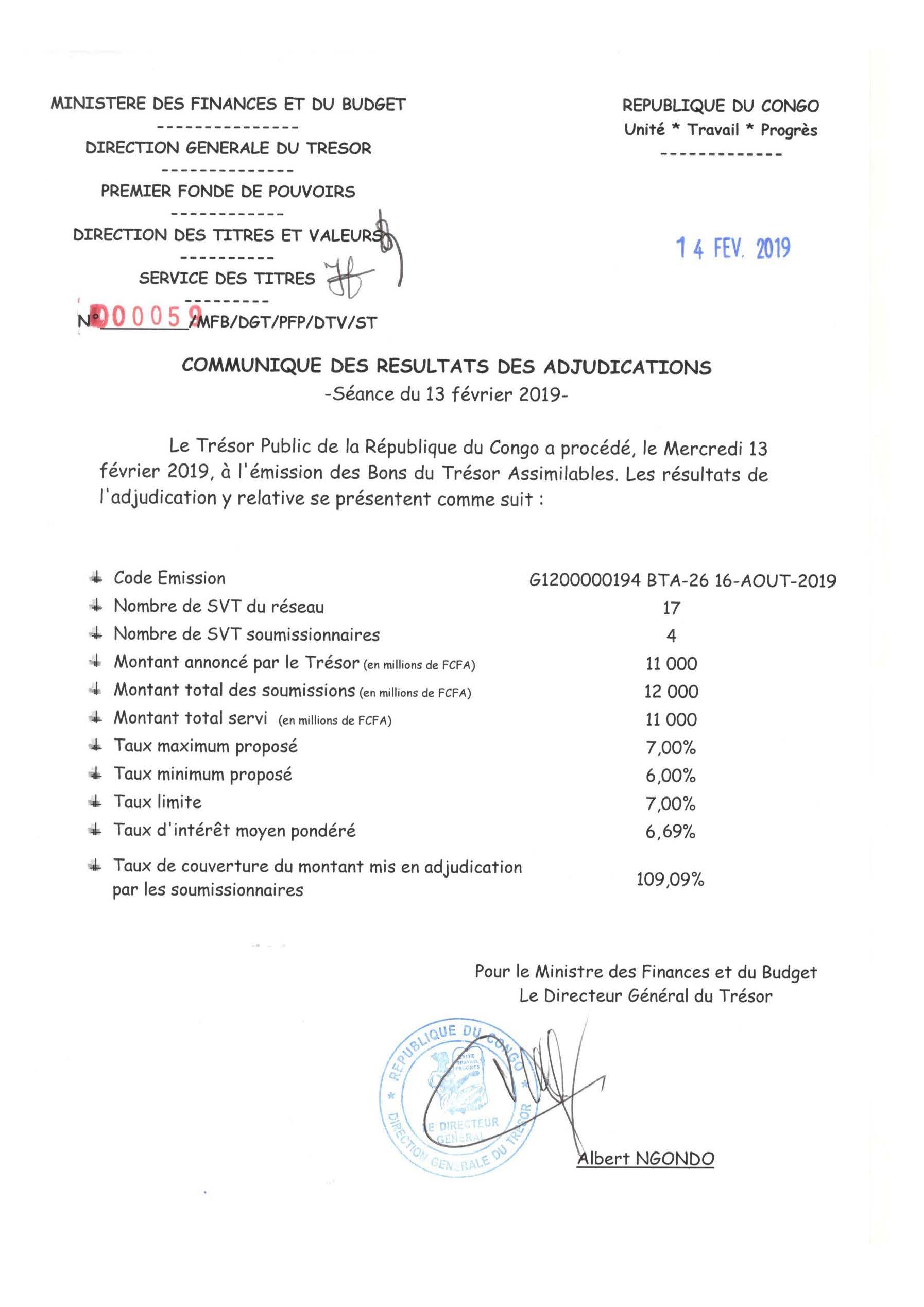 Communiqué des résultats d'adjudication des Bons de Trésor Assimilables de la République du Congo : séance du 13 Février 2019