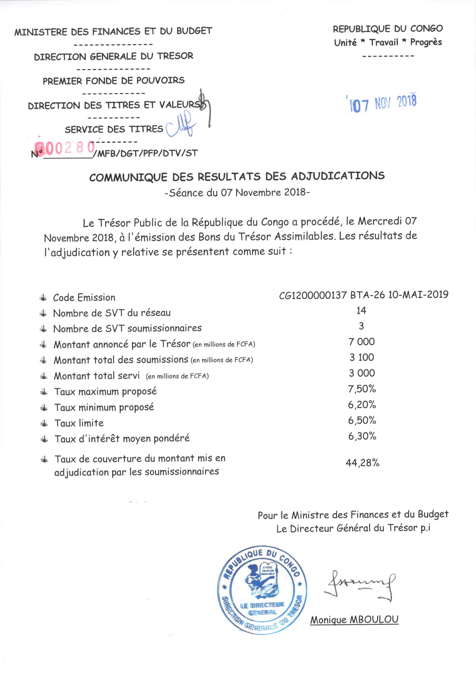 Communiqué des résultats d'adjudication des Bons de Trésor Assimilables de la République du Congo : séance du 07 Novembre 2018