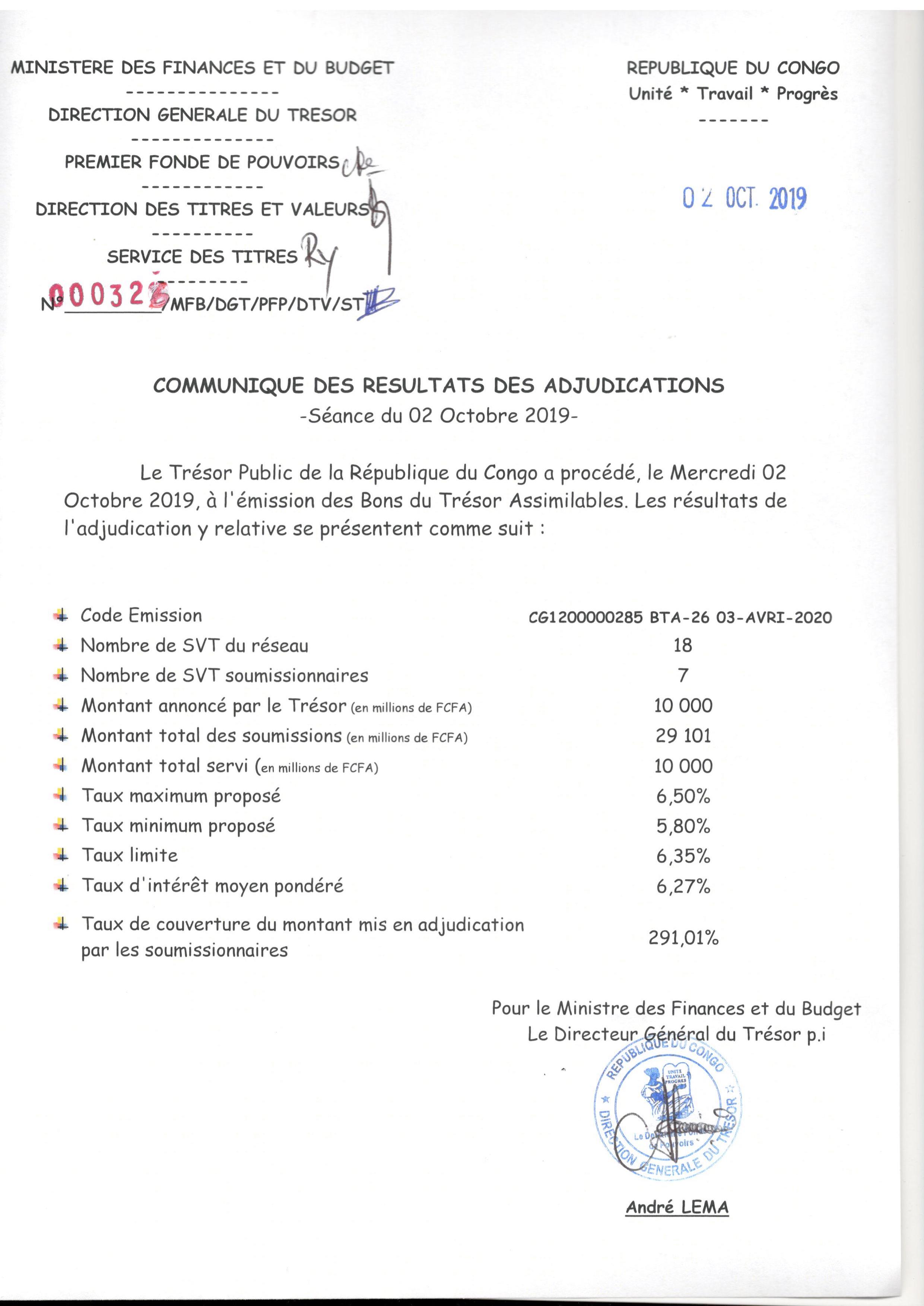 > Communiqué des résultats d'adjudication des Bons de Trésor Assimilables de la République du Congo : séance du 02 octobre 2019