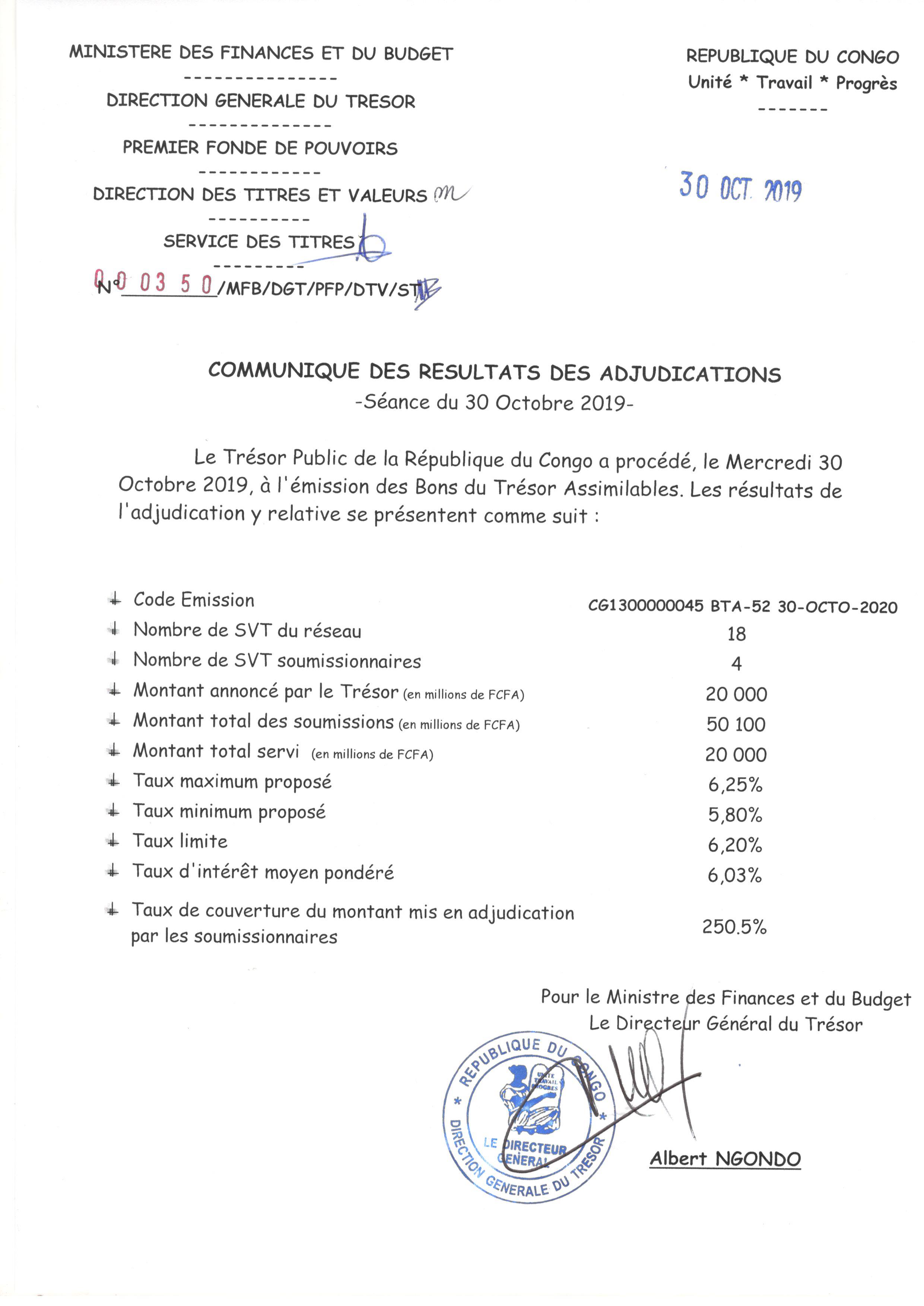> Communiqué des résultats d'adjudication des Bons de Trésor Assimilables de la République du Congo : séance du 30 octobre 2019