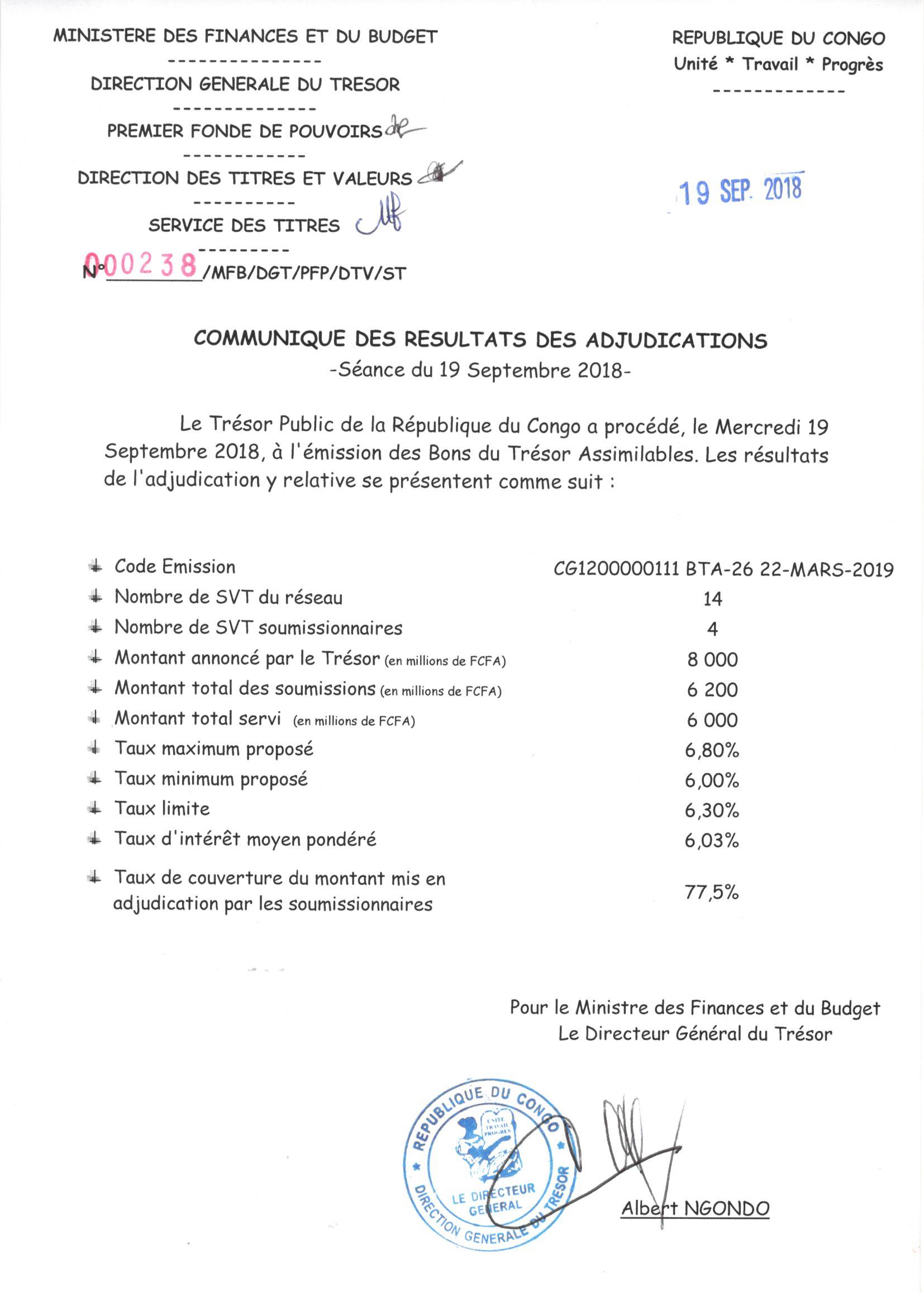 Communiqué des résultats d'adjudication des Bons de Trésor Assimilables de la République du Congo : séance du 19 Septembre 2018