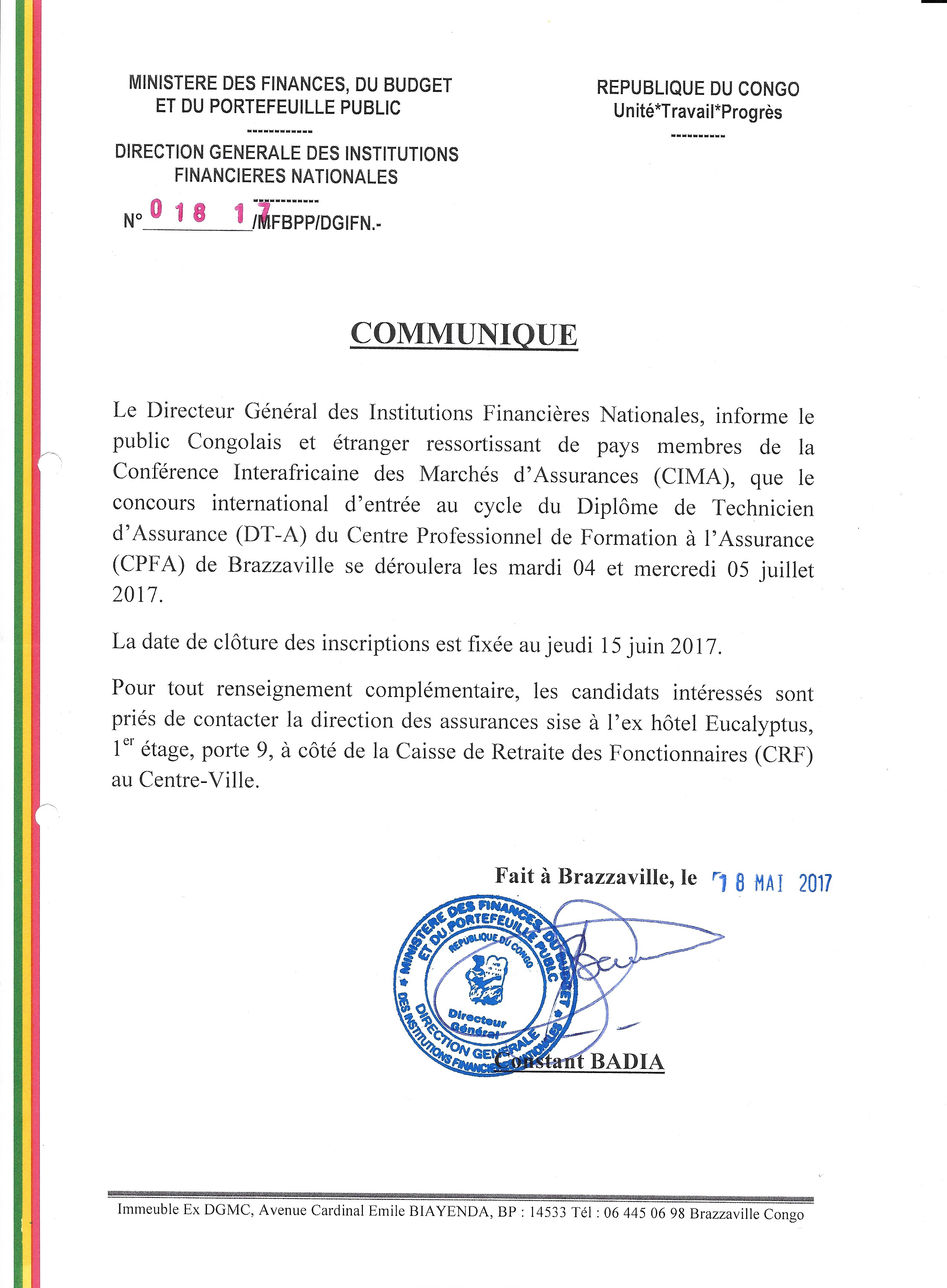 Communiqué DGIFN - Concours d'entrée au CPFA