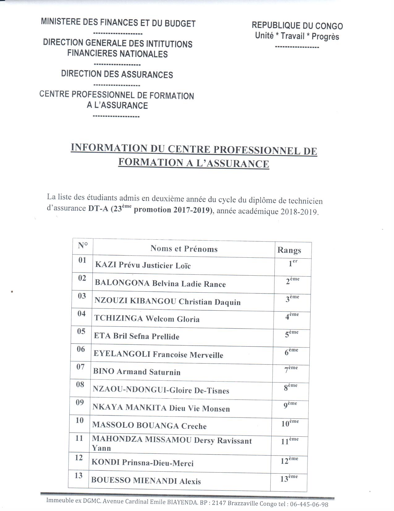 Communiqué du Centre Professionnel de Formation à l'Assurance - Publication de la liste des admis en 2ème année du cycle de diplôme de technicien d'assurance