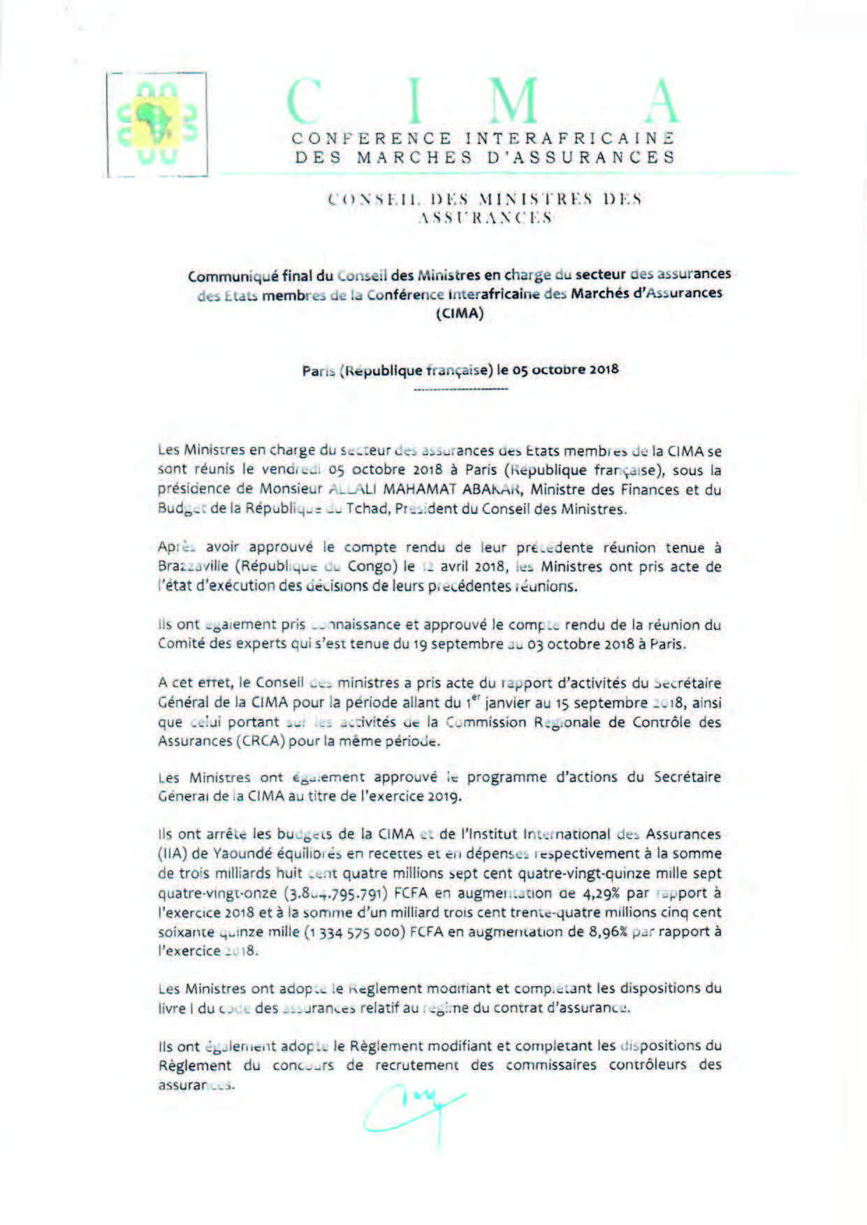 Communiqué final du Conseil des Ministres en charge du secteur des assurances des Etats membres de la Conférence Interafricaine des m-Marchés d'Assurances