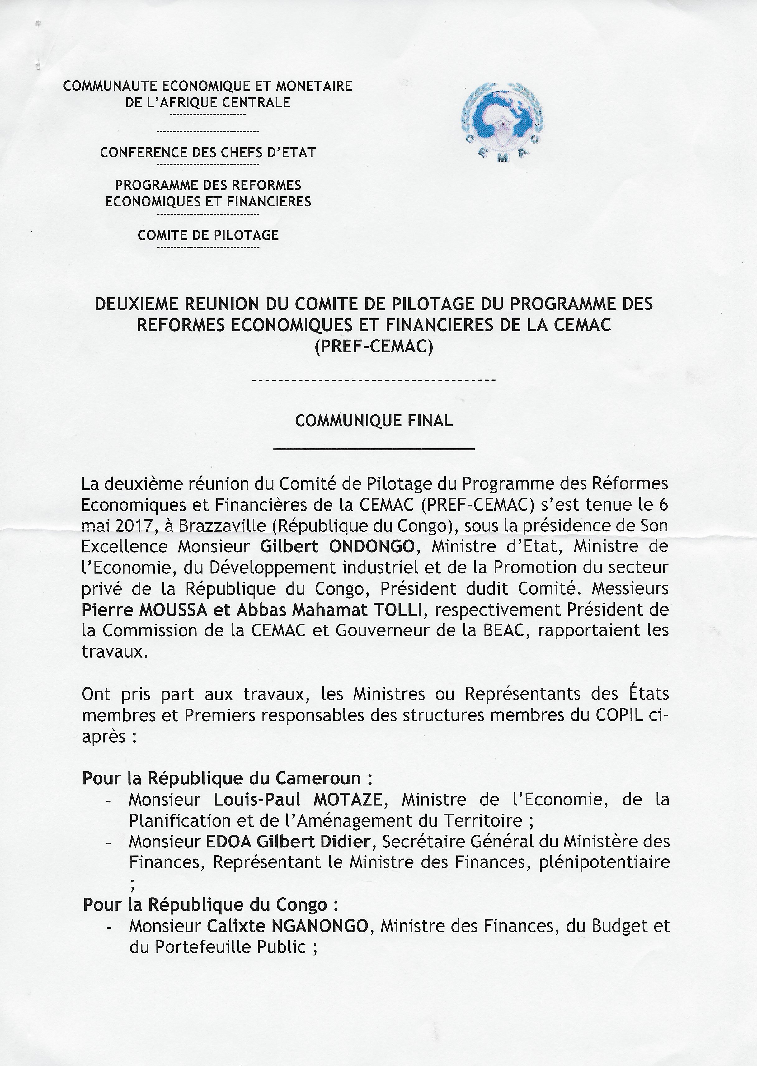 Communiqué final du PREF CEMAC du 06/05/17