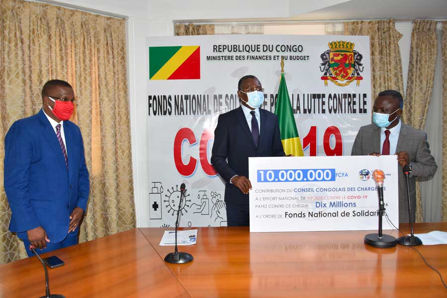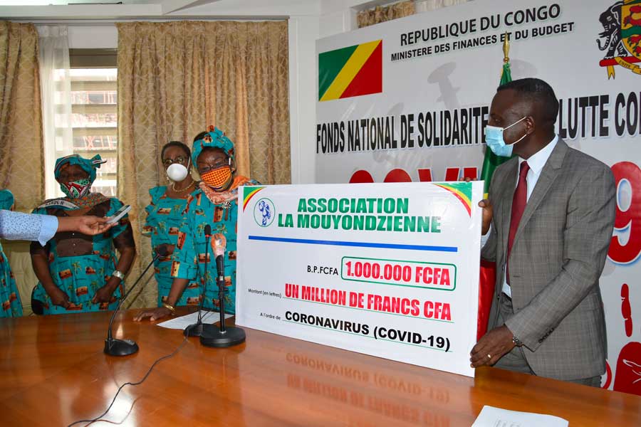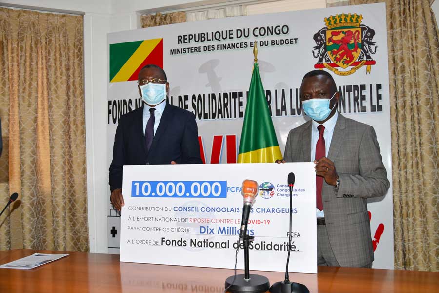 Mardi 19 mai 2020 à Brazzaville, Ludovic Ngatsé, Ministre délégué en charge du Budget, a réceptionné successivement les chèques de 1O millions émis par le Conseil congolais des chargeurs (CCC) et de 1 million de F CFA par l’Association La Mouyondzienne (ALM), comme contribution à l’effort national de riposte contre le Covid-19.