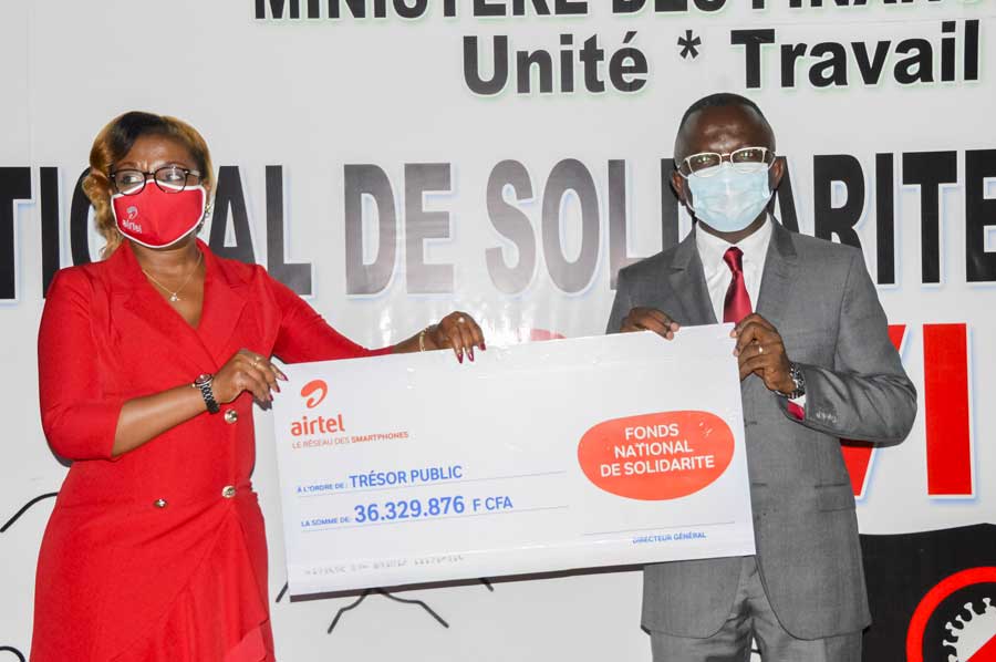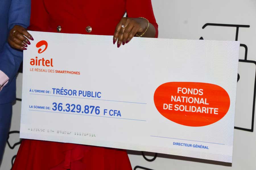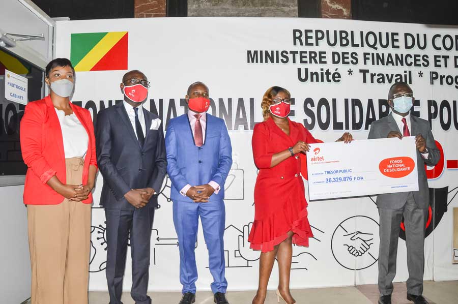 Mardi 25 août 2020 à Brazzaville, Ludovic Ngatsé, Ministre délégué en charge du Budget, a recueilli des mains de la Directrice des ressources humaines (DRH) de la société de téléphonie mobile Airtel Congo, Madame Nives Ornella Malanda, un chèque de 36 millions 329.876 F CFA, représentant la contribution des agents de cette entreprise au Fonds national de solidarité et au fonds Covid-19.