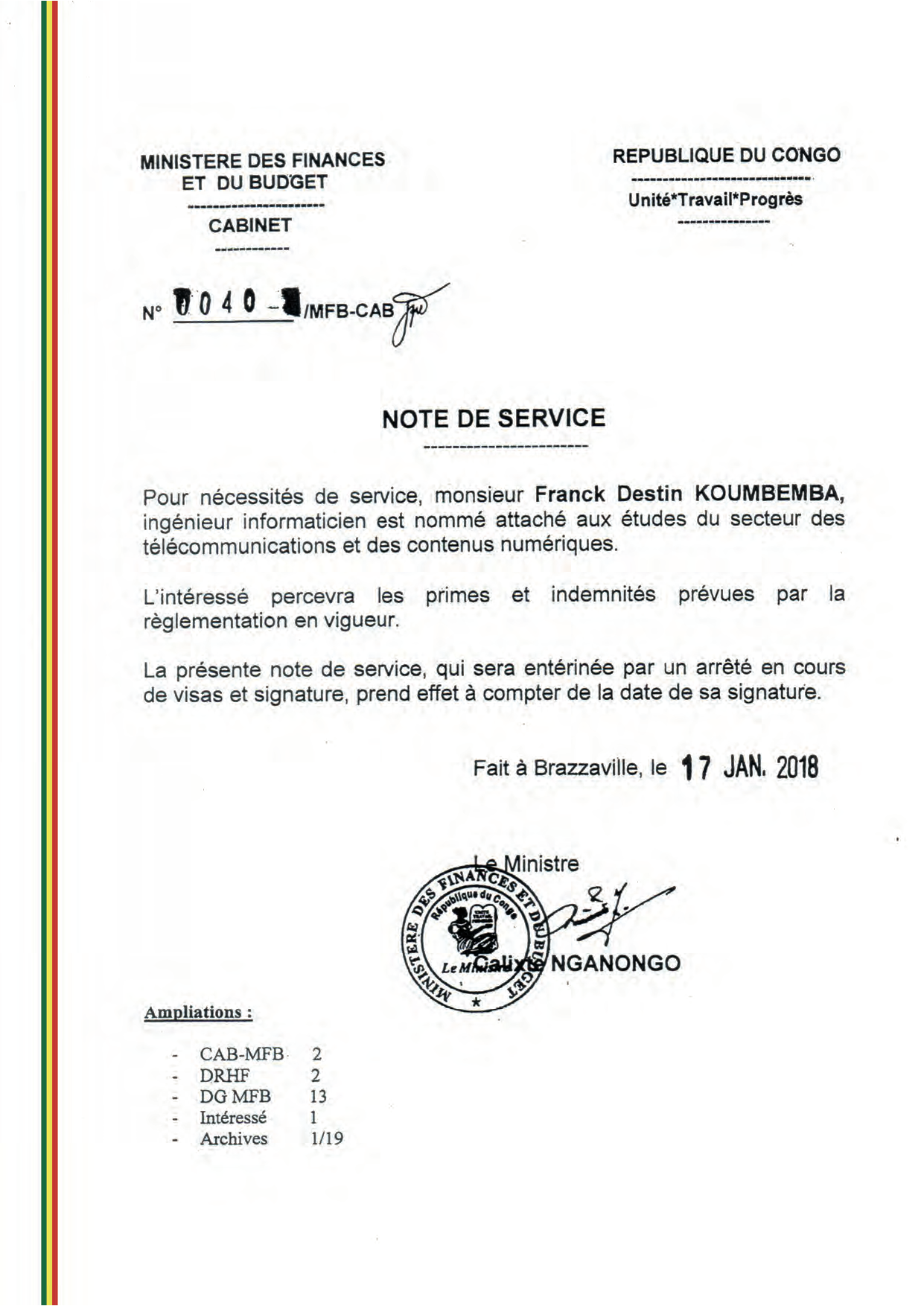 > Note de service n°0040/MFB-CAB relative à la nomination de l'Attaché aux études du secteur des télécommunications et des contenus numériques