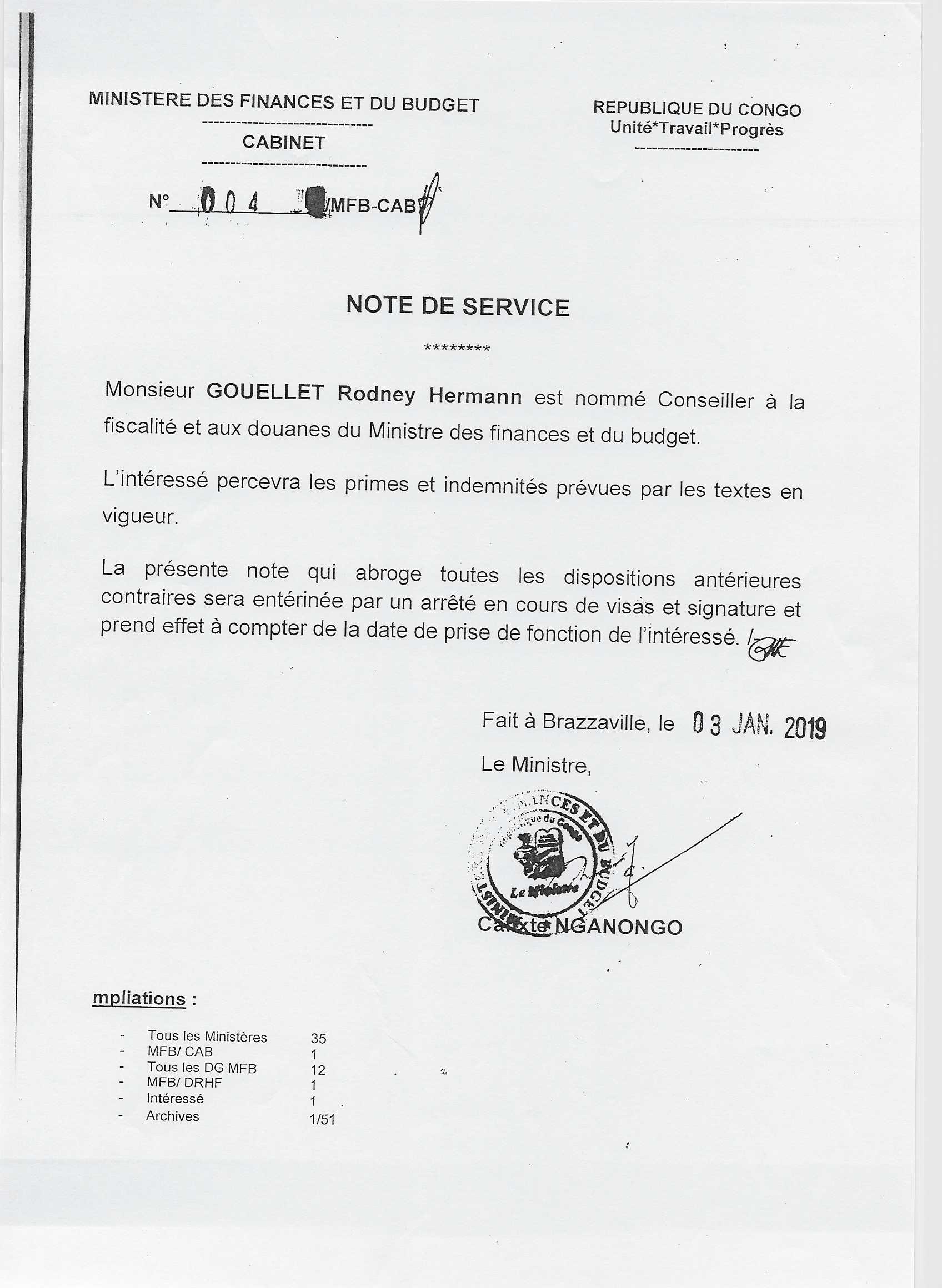 > Note de service n°004/MFB-CAB relative à la nomination du Conseiller à la fiscalité et aux douanes