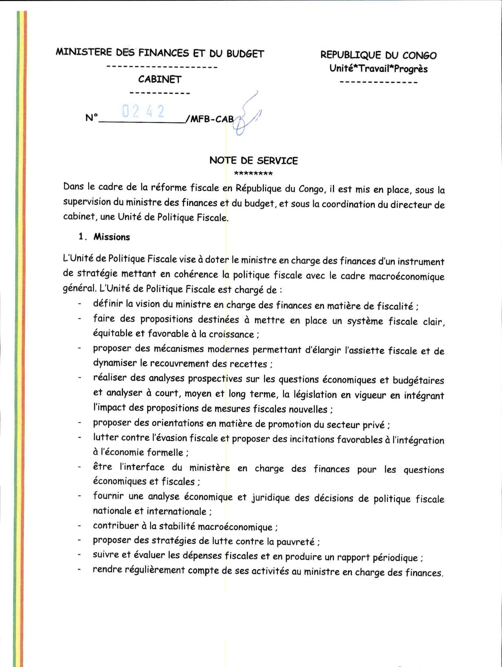 > Note de service n°0242/MFB-CAB relative à la mise en place de l'Unité de Politique Fiscale