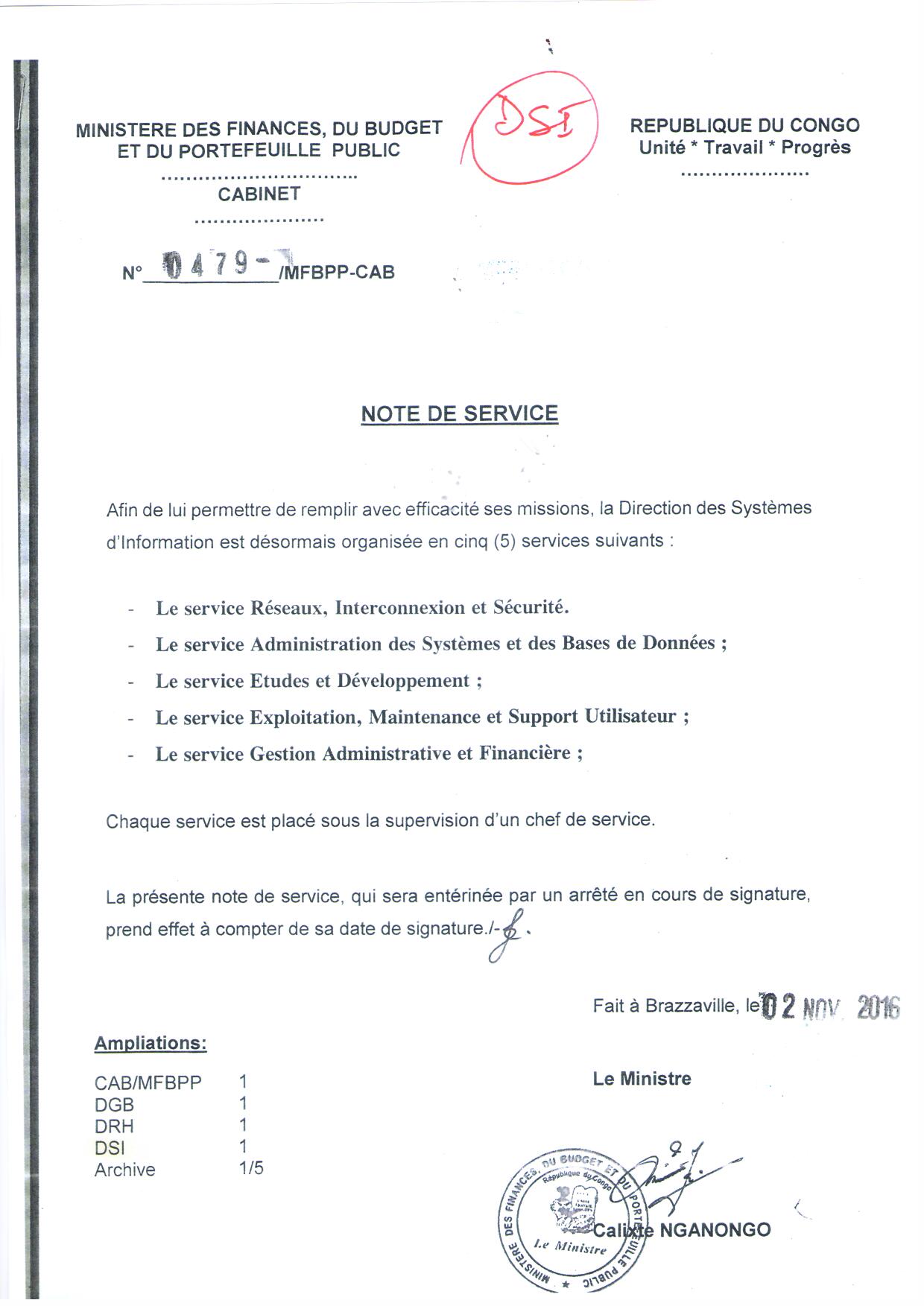 > Note de Service N°0479/MFB/CAB Organigramme DSI